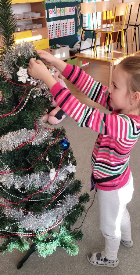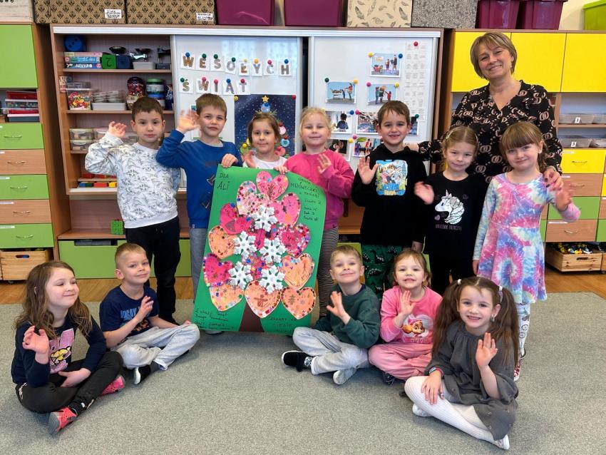 Dzieci z grupy Mróweczek podczas realizacji projektu DZIECI UCZĄ RODZICÓW rozmawiały o pomaganiu innym i okazywaniu życzliwości w okresie świątecznym. Do kanonu dobrych manier wpisały również POMAGANIE. Po wysłuchaniu opowieści Światełko i pomocnik Świętego Mikołaja przekonały się, że każdy moży być małym aniołkiem, pomagając innym i szerząc radość. I dlatego zachęcając do robienia dobrych uczynków przedszkolaki ozdabiły serce życzliowści dla swojej koleżanki z grupy z długoterminową nieobecnością i wraz z paniami z grupy utworzyły kolorową choinkę. Trzeba przyznać, że wykonane serca sprawiły nam wiele radości.