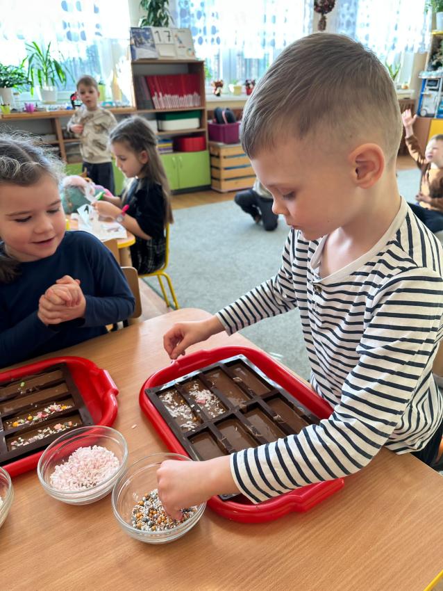 W dniu dzisiejszym dzieci z grupy Mróweczki przygotowały słodkie niespodzianki dla swoich dziadków z okazji Dnia Babci i Dziadka. Najpierw każdy przedszkolak podzielił czekoladę na drobne kawałki, potem Panie roztopiły ją na jednolitą masę i rozlały do pojemników. Następnie samodzielnie ozdabiały batoniki według własnego pomysłu. Dzieci dołożyły ogrom starań w wykonanie słodkości dla swoich ukochanych dziadków. Wszyscy jesteśmy bardzo zadowoleni z efektów naszej pracy.