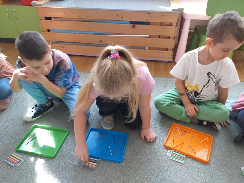 Przedszkolaki po zapoznaniu z cyfrą 3 współpracują w grupach 3-osobowych. Przy użyciu różnych materiałów układają poznaną liczbę rozwijając koordynację wzrokowo-ruchową.