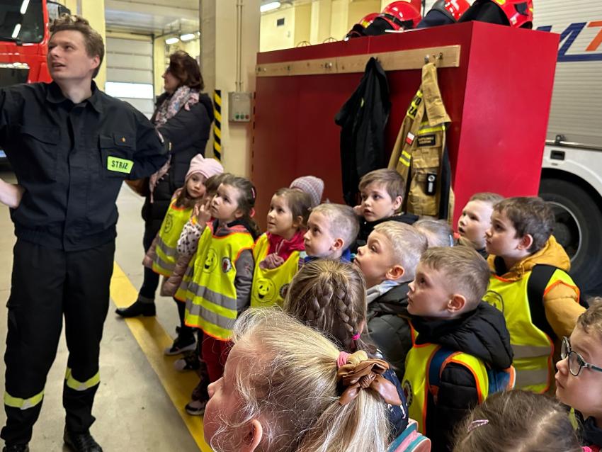 W dniu dzisiejszym dzięki życzliwości Strażaków z Jednostki Ratowniczo-Gaśniczej nr 6 w Krakowie przy ul. Aleksandry 2 przedszkolaki obejrzały z bliska wozy strażackie i sprzęt pożarniczy. Dzieci dowiedziały się o odpowiedzialnej i niebezpiecznej pracy strażaków. Zrozumiały, że strażak pomaga nie tylko w czasie pożaru, ale również bierze udział w różnego rodzaju akcjach ratowniczych. Z dużym zainteresowaniem oglądały strój strażaka i przymierzały hełm strażacki. Pan Strażak przypomniał w jakich okolicznościach można wezwać straż pożarną, a przedszkolaki utwaliły numery alarmowe: 998 i 112. Dużą atrakcją dla dzieci były zawody w zwijaniu węża strażackiego w dwóch zespołach, wszyscy starali się jak tylko mogli, dziewczynki poradziły sobie wyśmienicie. Na koniec przedszkolaki zjadły II śniadanie w prawdziwej strażackiej jadalni. Wróciły do przedszkola pełne wrażeń, a zdobyta wiedza zachowa się na długo w pamięci.