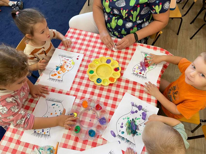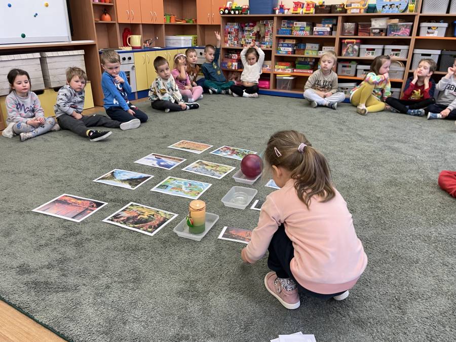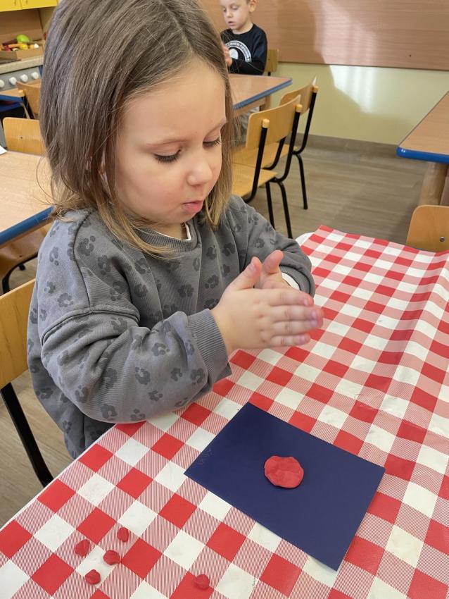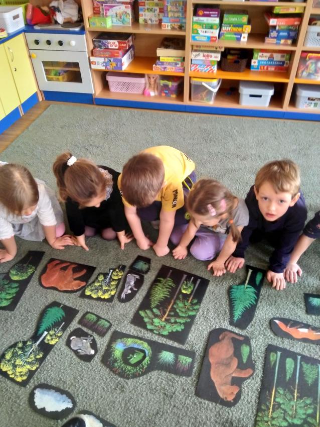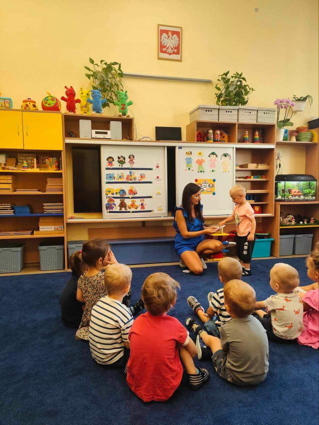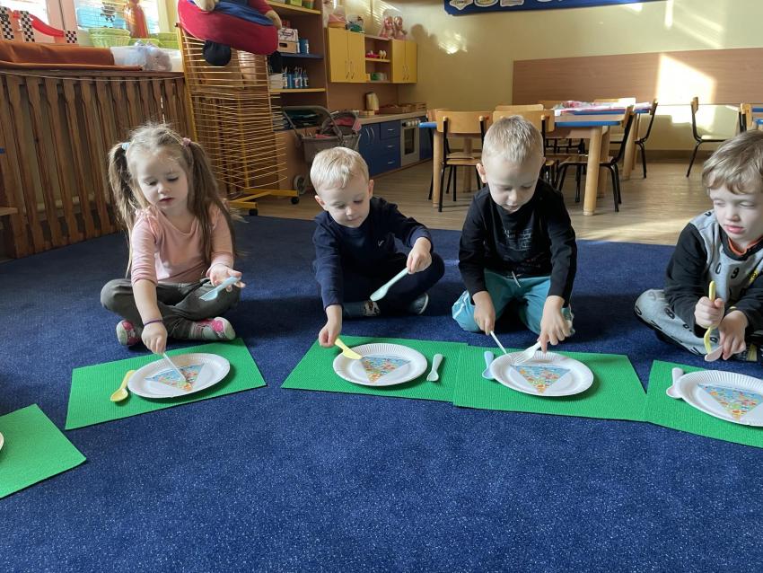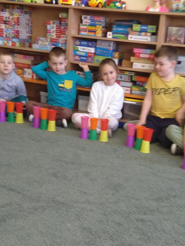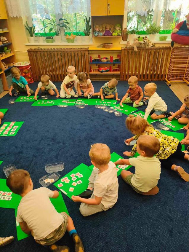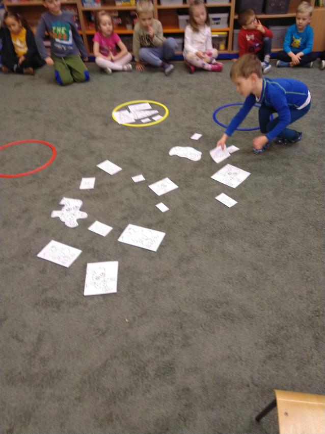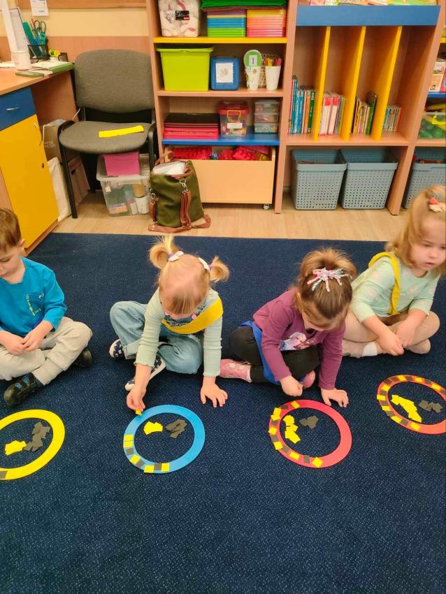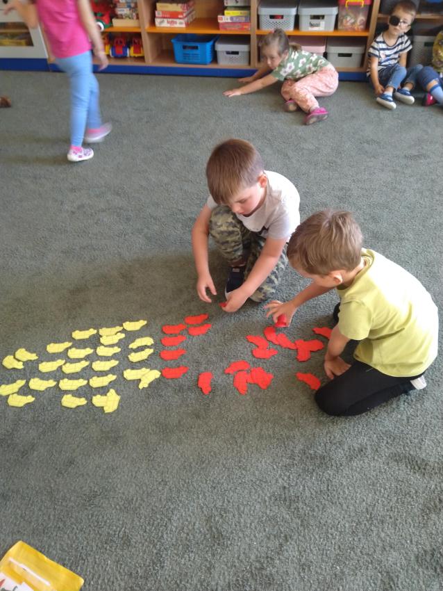 Dzieci z grupy Pingwinków podczas zabaw matematycznych uczyły się klasyfikowania zbioru na podzbiory wg ustalonej cechy  - koloru, następnie porównywały liczebność zbiorów poprzez ustawianie elementów w pary.