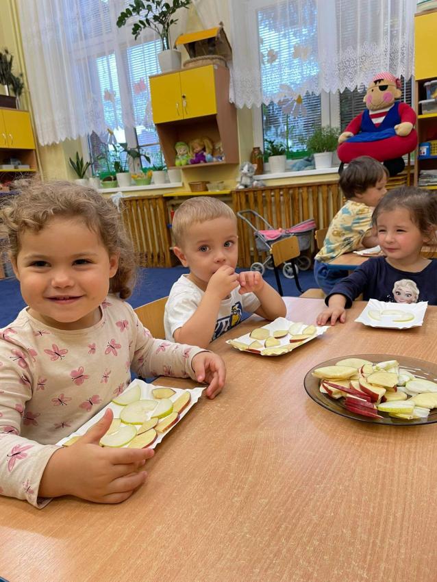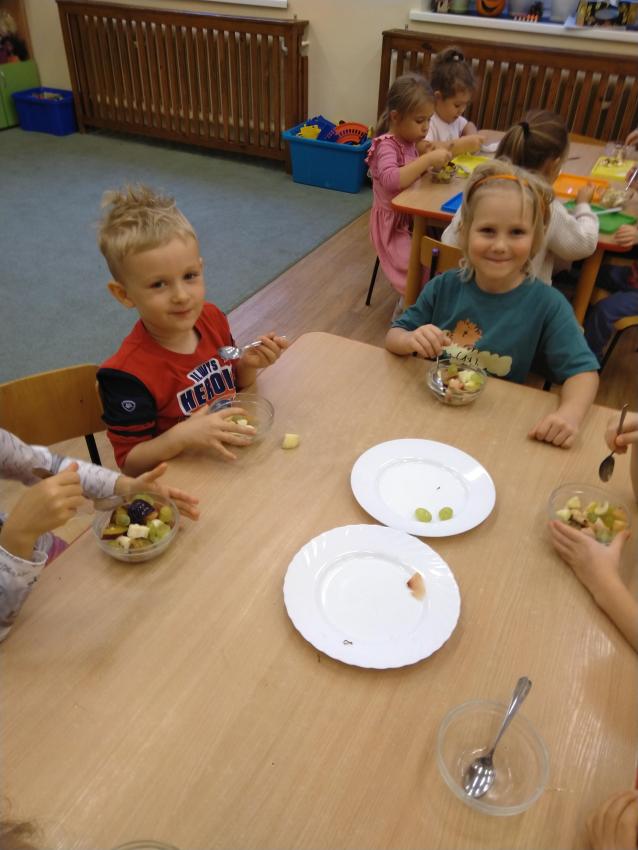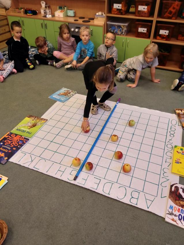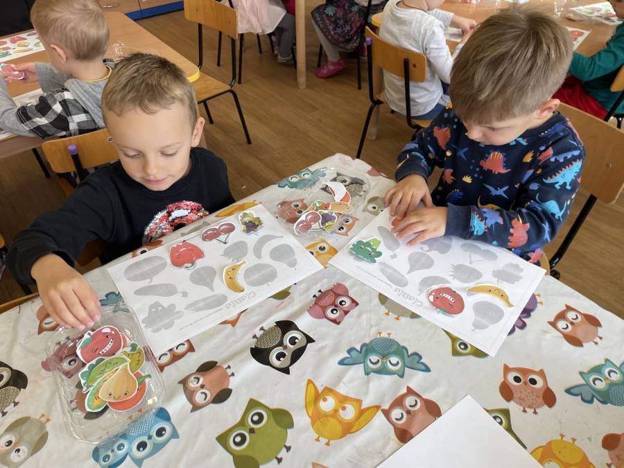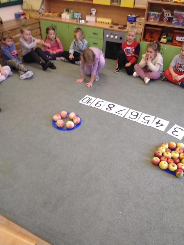 Pingwinki podczas zabaw poznawały zapis cyfrowy liczb, klasyfikowały zbiór owoców, przeliczały, porównywały ilość. Wykonały pracę: puzzle paskowe z sylwetą jabłka i cyframi w zakresie 1-5.