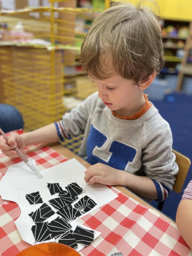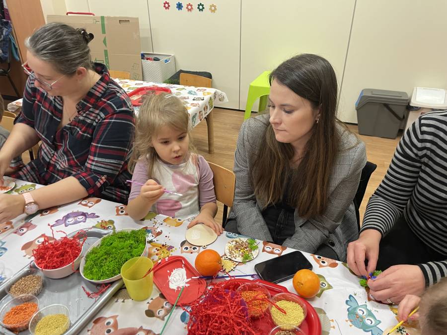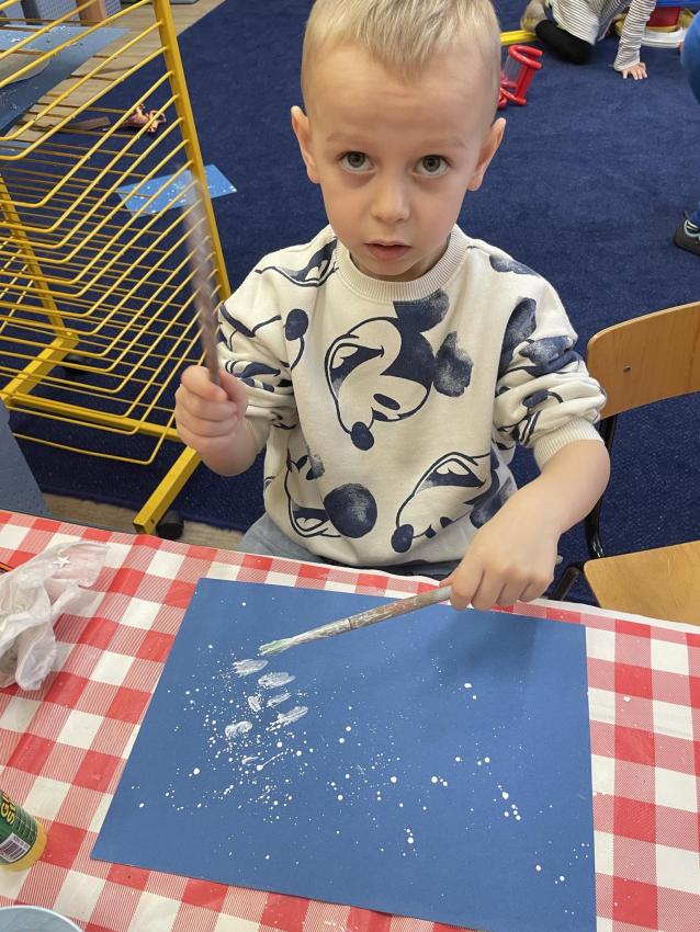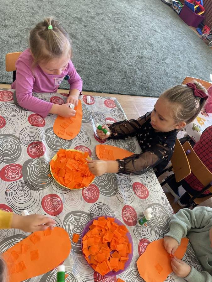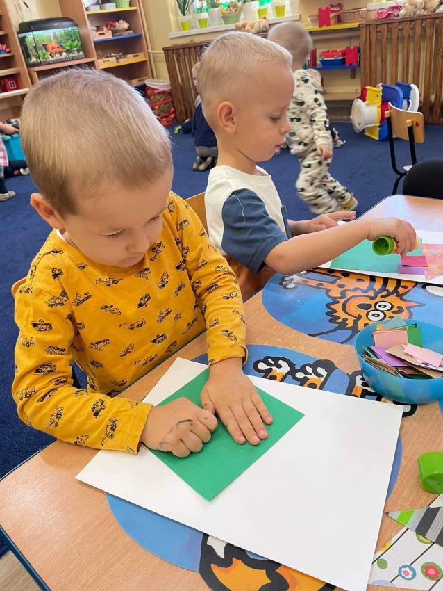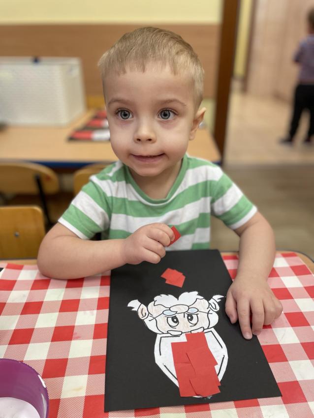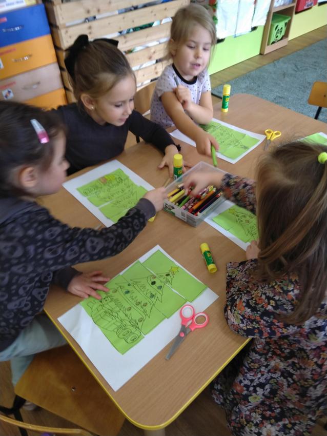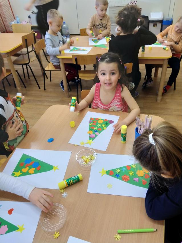Dzisiaj wykonywaliśmy pracę plastyczną, podczas której ozdabialiśmy sylwetę choinki. Uczymy się posługiwać klejem, doskonalimy koordynację wzrokowo-ruchową oraz rozwijamy poczucie estetyki.  Nasze prace są ładne i kolorowe!