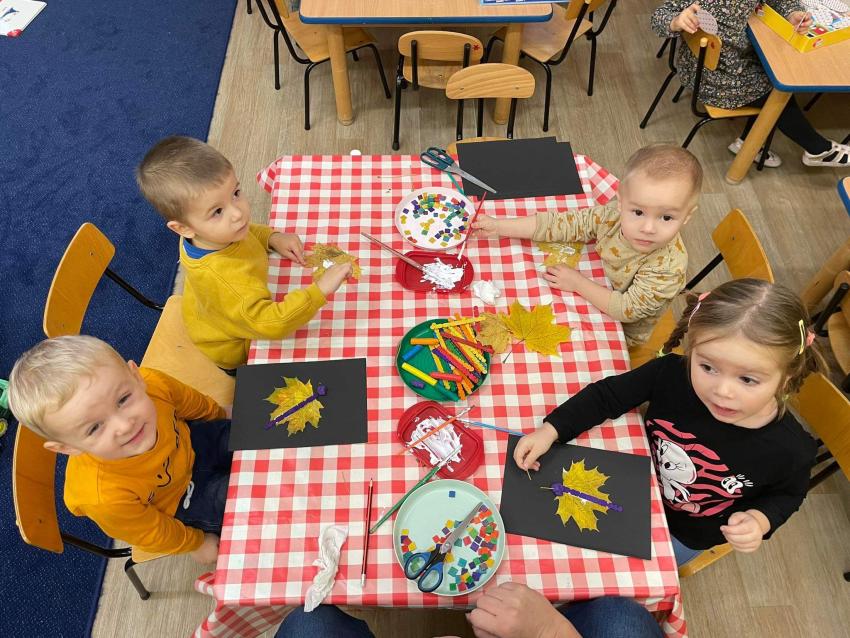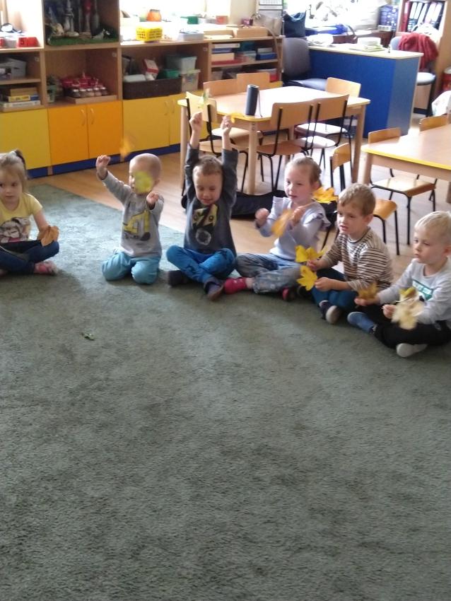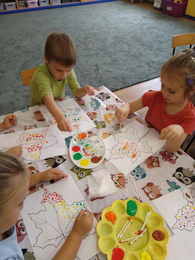 Dzieci z grupy Pingwinków podczas zajęć plastycznych wykonywały pracę pt.: ?Jesienny liść? przy użyciu farb plakatowych oraz patyczków. Od tej pory będziemy obserwować kolory jesiennych liści w naturze podczas wyjść do ogrodu przedszkolnego.
