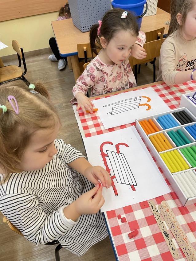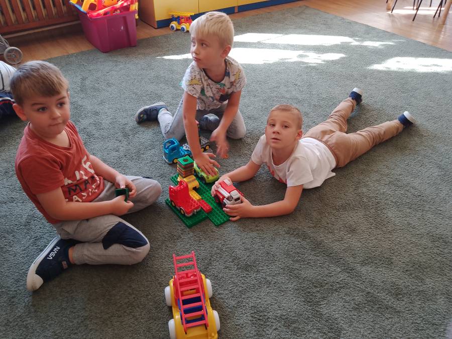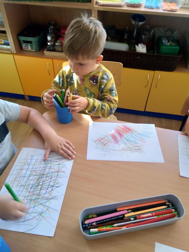 Pingwinki podczas zajęć z wykorzystaniem elementów metody Doroty Dziamskiej - Edukacja przez Ruch wykonały pracę plastyczną pt.: ?Samochodzik?. Najpierw rysowały tor jazdy samochodem, następnie komponowały z gotowych elementów sylwetę samochodu. Pingwinki są pracowite  i uważnie słuchają, dzięki temu powstały kolorowe autka.