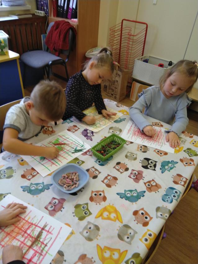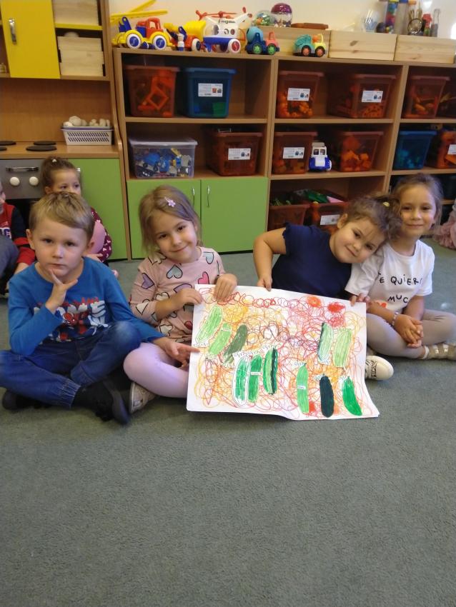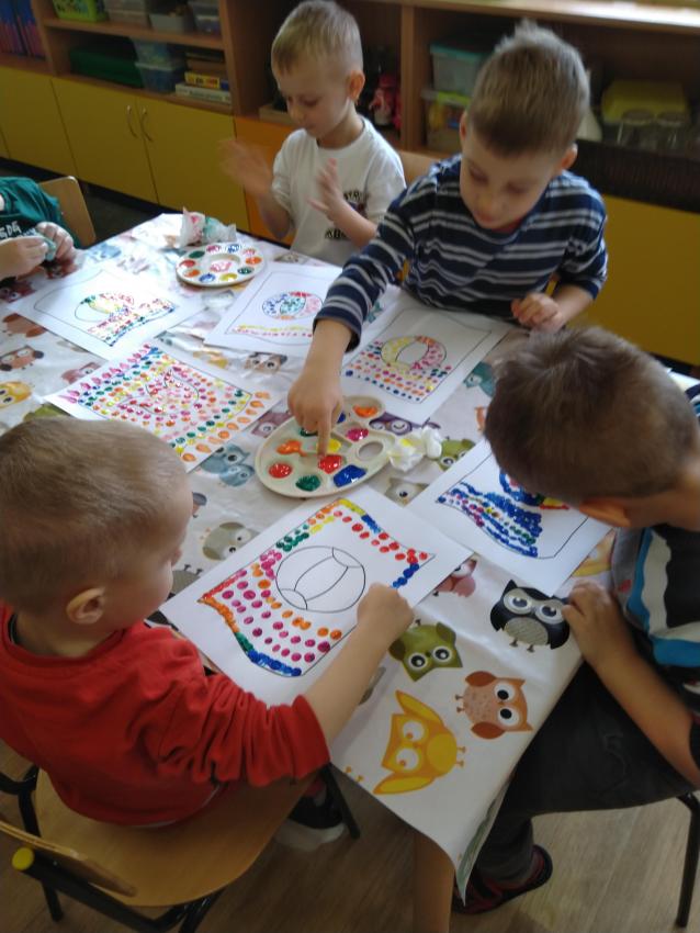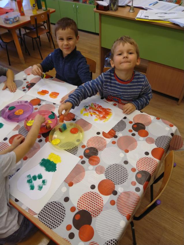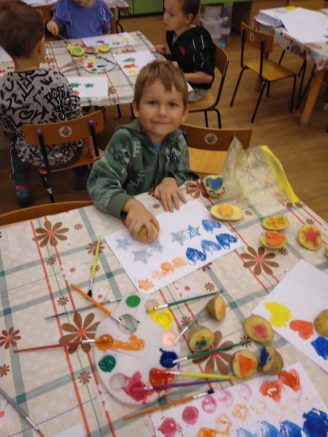 Dzisiaj dzieci z gr. IV stemplowały pieczątkami wyciętymi z ziemniaków. Było to nowe i ciekawe doświadczenie dające dzieciom wiele radości.  Pieczątki były  pięknie  przygotowane i ciekawe.