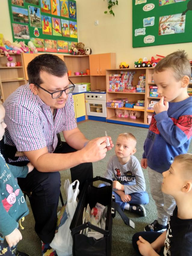 Dzisiaj odwiedził nas tatuś Zbysia. Pan doktor opowiedział nam o swojej pracy. Rozmawialiśmy tez o ciele człowieka, o wewnętrznych organach, jak dbać o swoje zdrowie. Pan doktor pokazał nam wyposażenie torby lekarskiej i wyjaśnił do czego służą poszczególne akcesoria. Podczas zabawy mogliśmy posłuchać bicia serca swoich rówieśników. Bardzo serdecznie dziękujemy za wspaniałą opowieść i wizytę!!