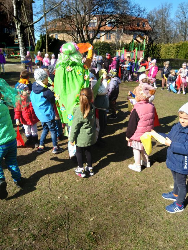 21 marca Pingwinki wraz z całą społecznością przedszkola podczas zabaw w ogrodzie przedszkolnym pożegnały Panią Zimę, przywitały nadejście nowej pory roku oraz Panią Wiosnę.