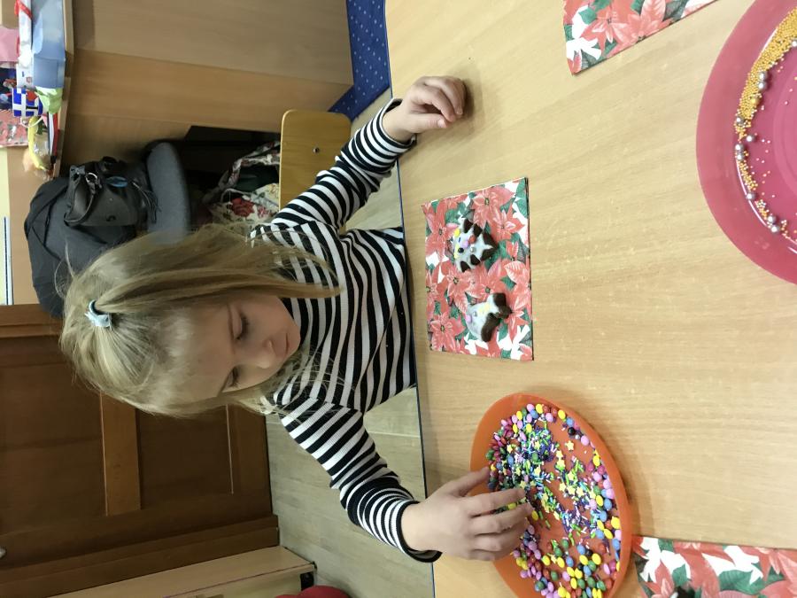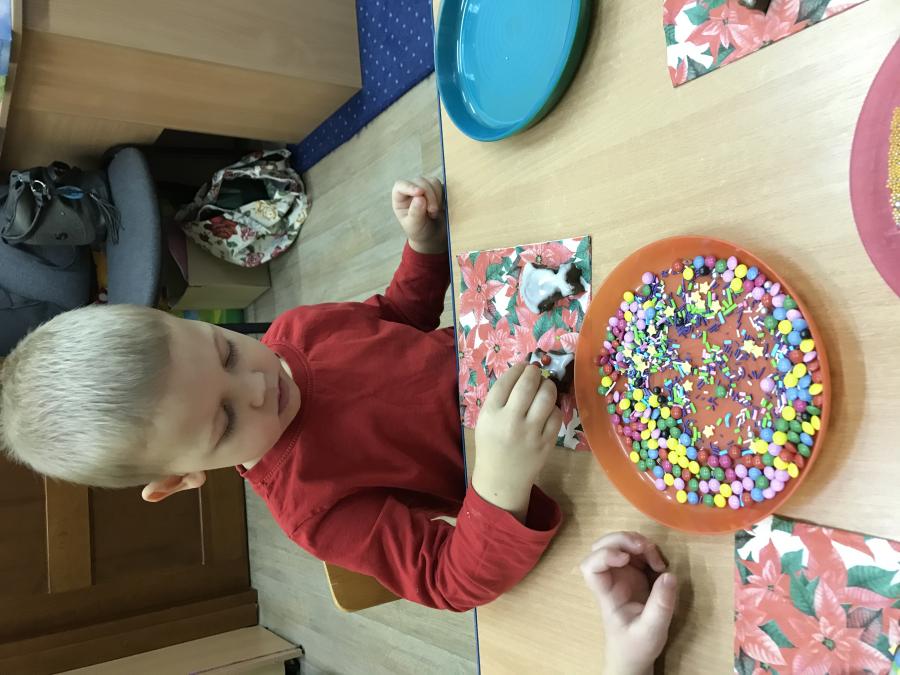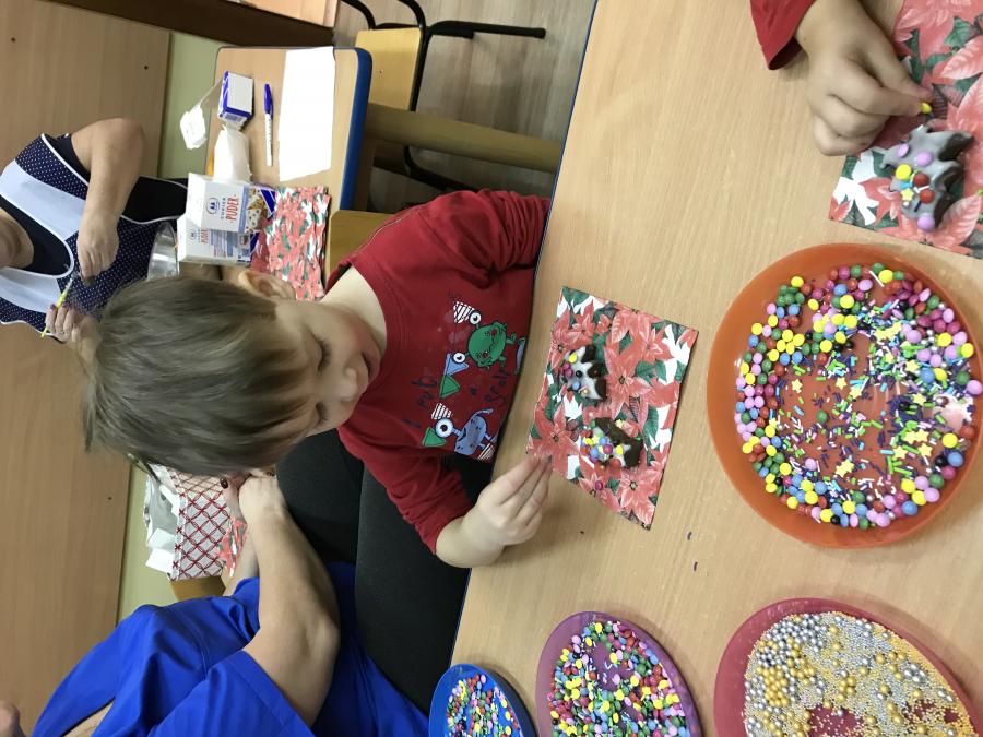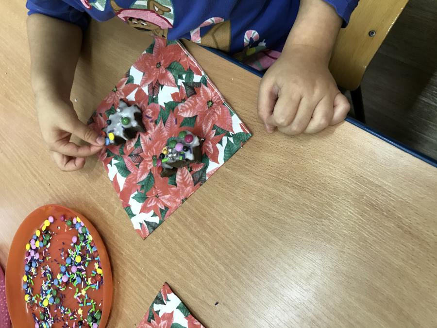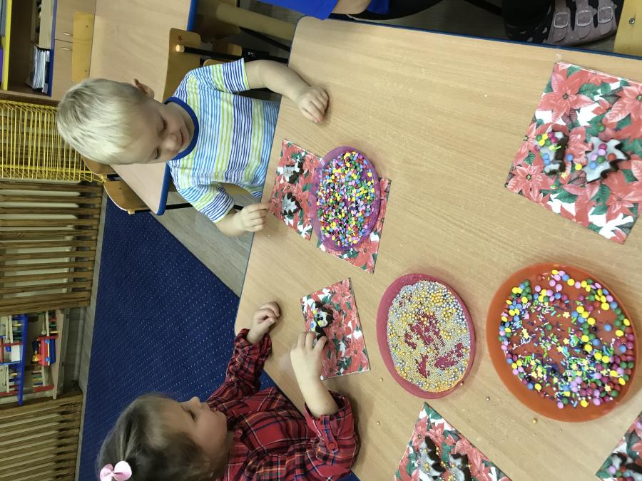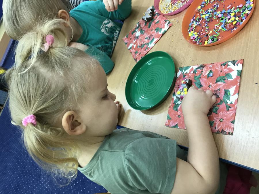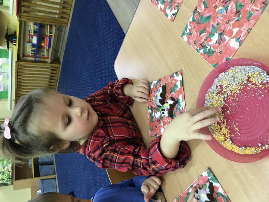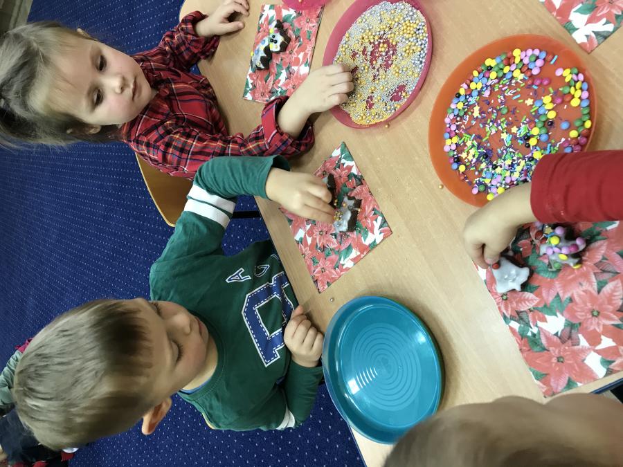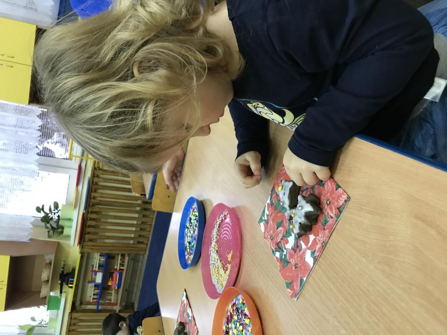 Świątecznych aktywności nigdy dość! W miniony poniedziałek Dzieci z grupy Myszek z wielkim zaangażowaniem dekorowały bożonarodzeniowe pierniczki. Słodką paczuszkę zabrały później do swoich domów.