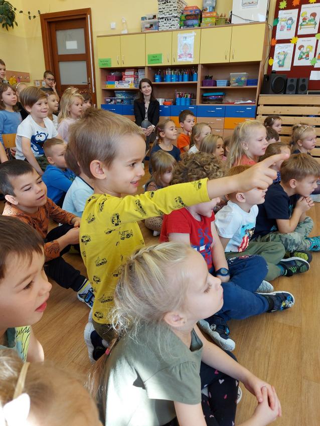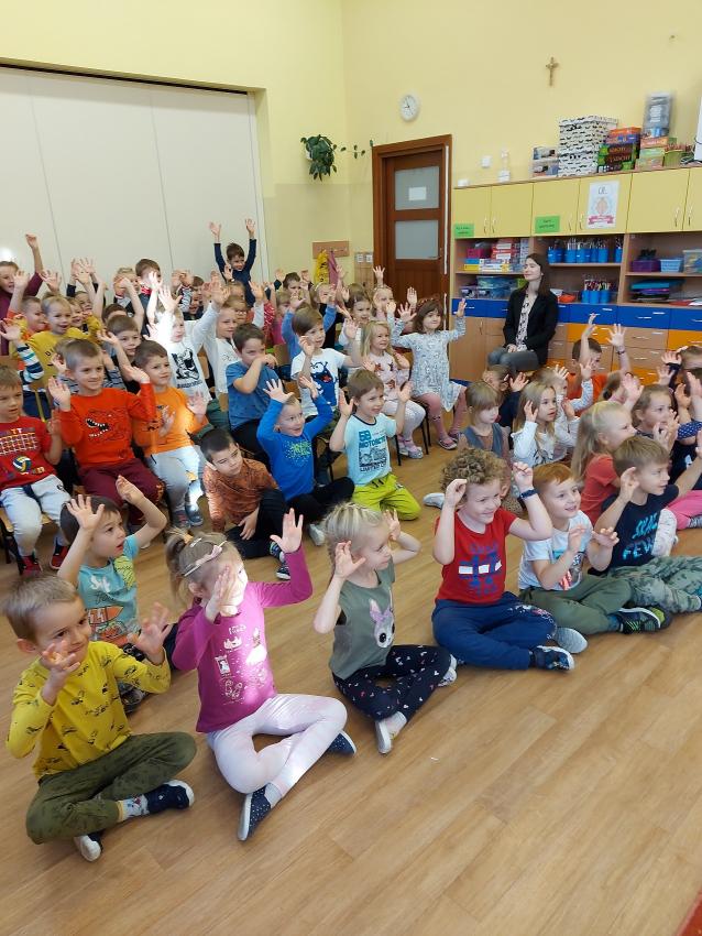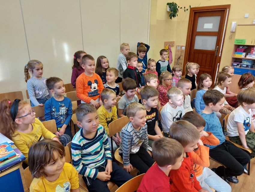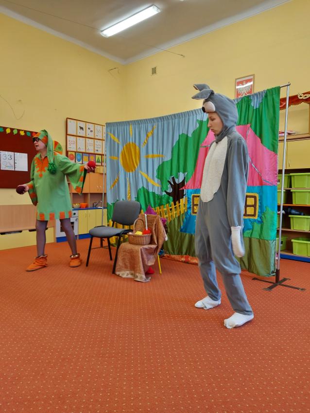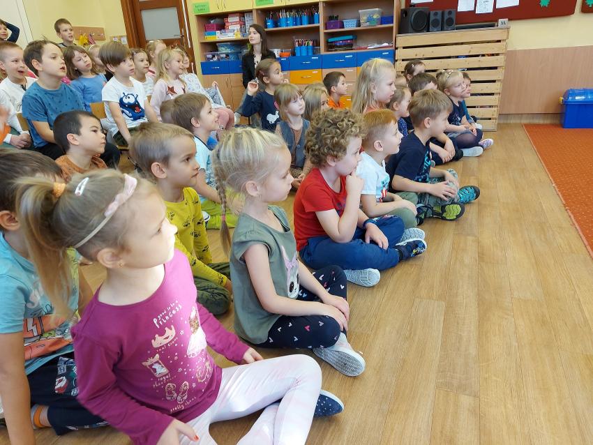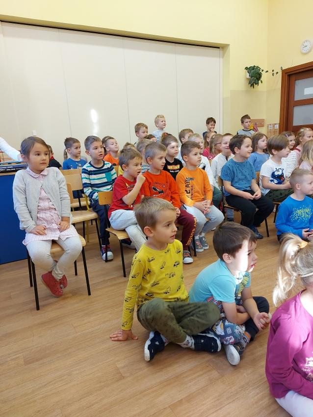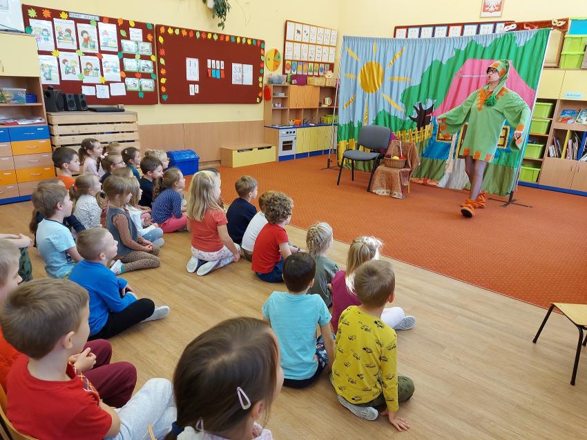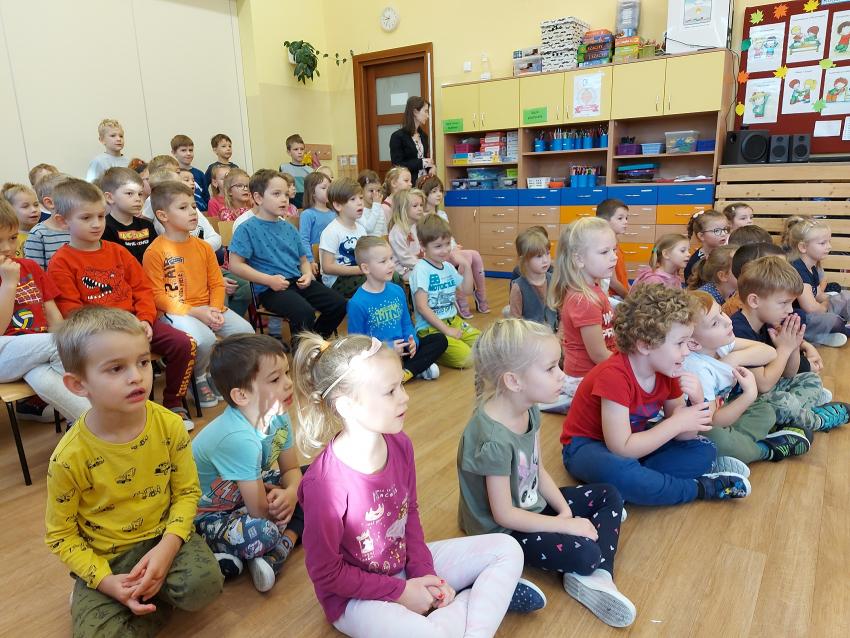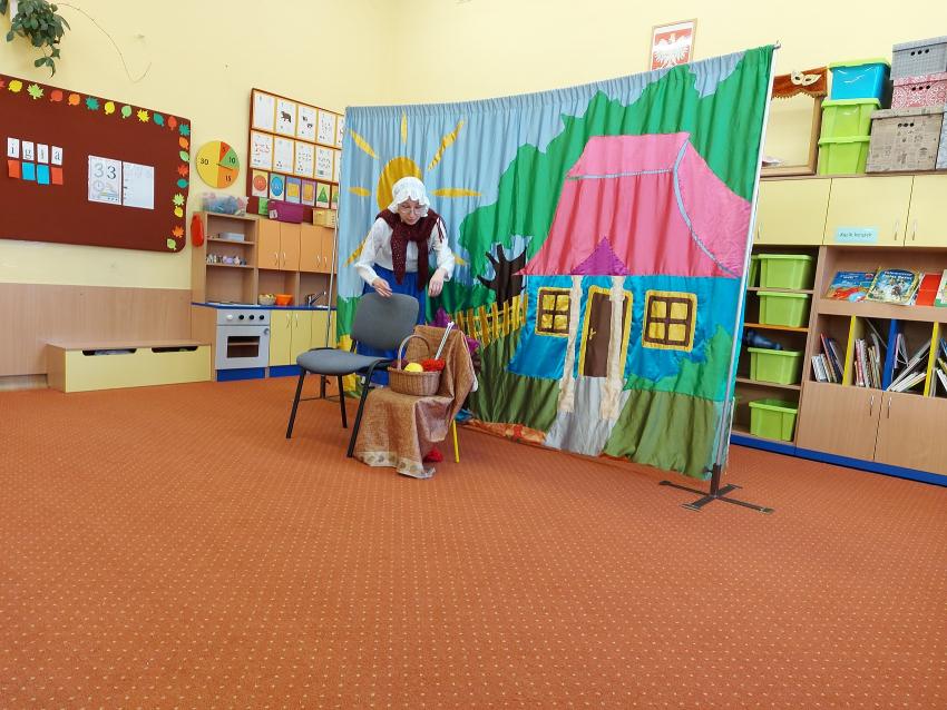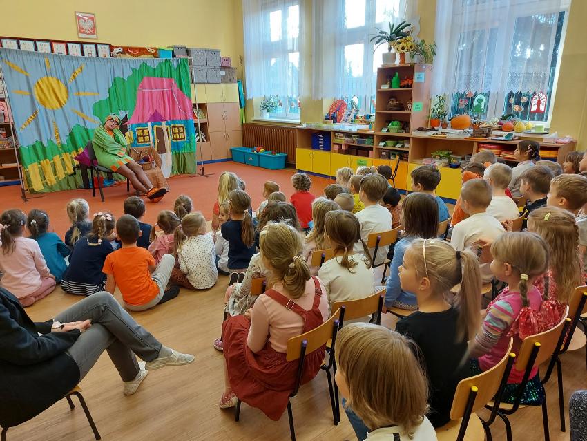 2021-10-21 Przedszkolaki oglądają przedstawienie " O krasnoludku, babci i kolorowych kulkach"
