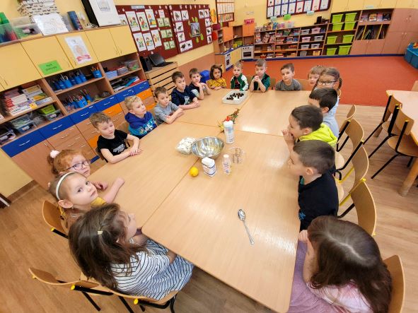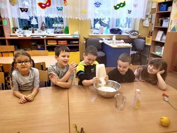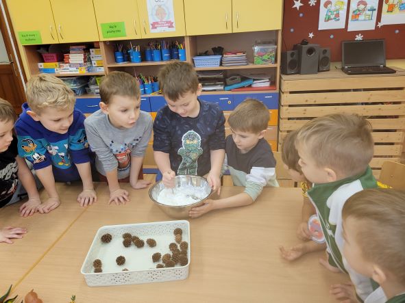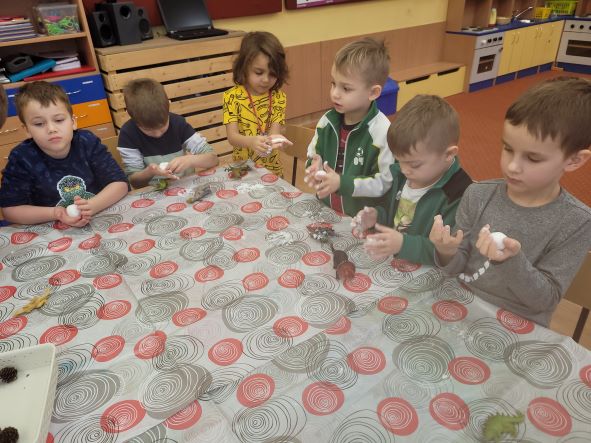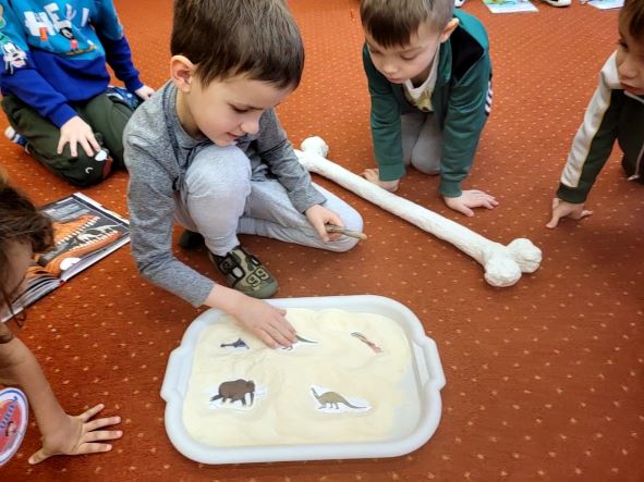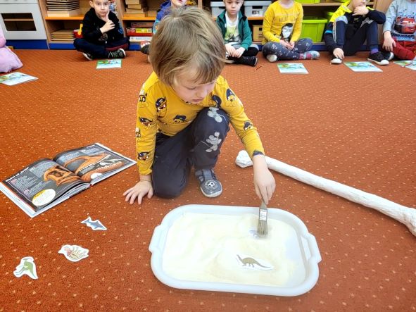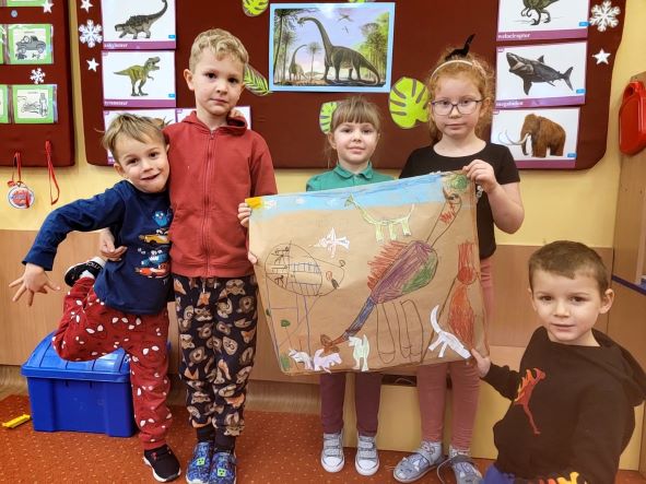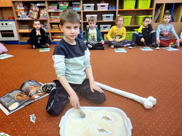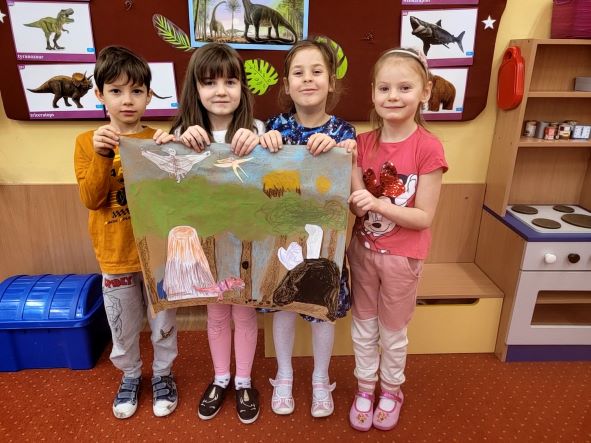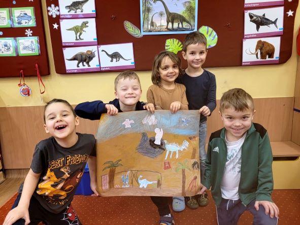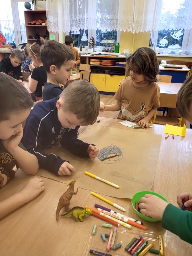 Podczas ostatnio minionych zajęć dzieci poszerzały swoją wiedzę o dinozaurach, ich wyglądzie i sposobie zachowania. Pracowały grupowo tworząc plakat obrazujący życie prehistoryczne. Przedszkolaki stworzyły także wspólnie masę porcelanowa, z której powstały skamieliny.