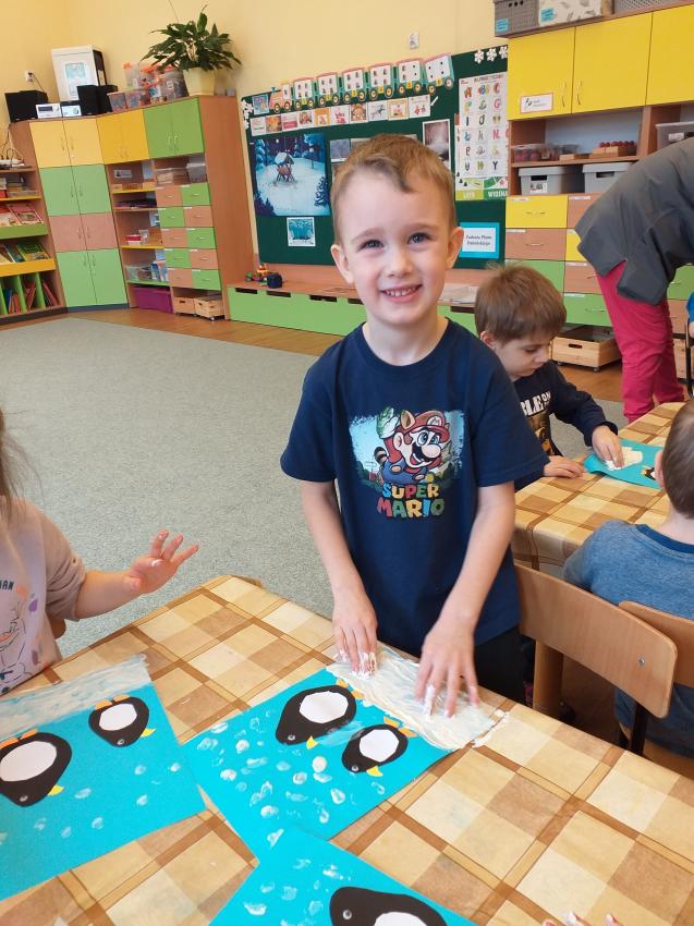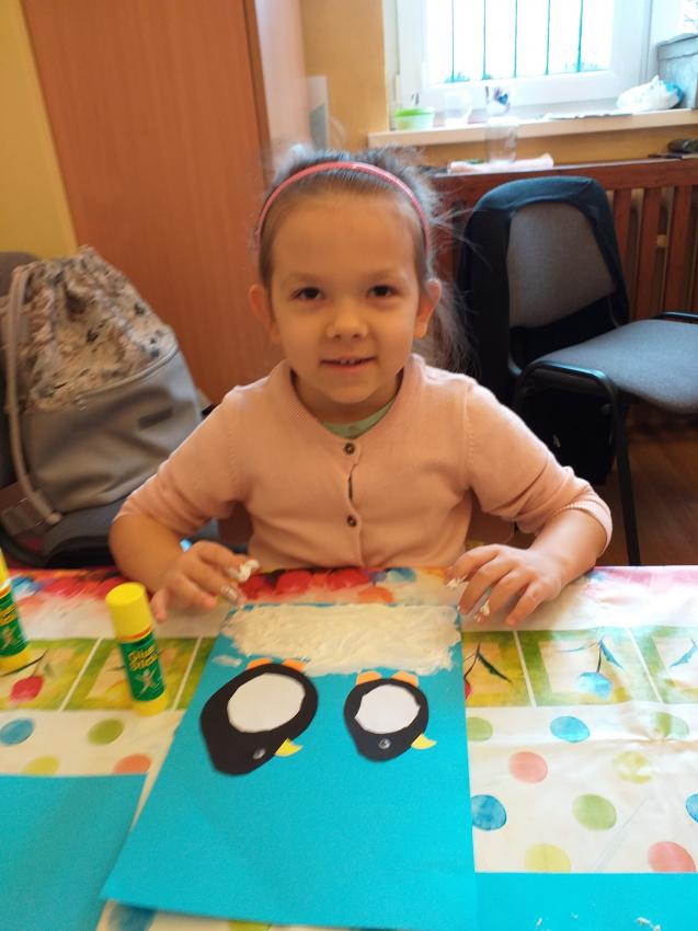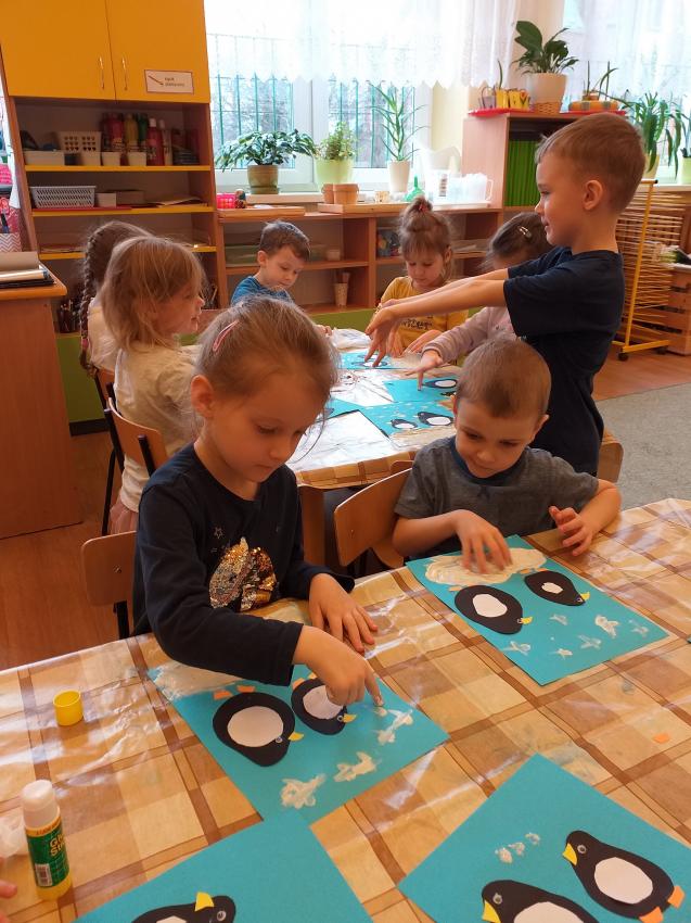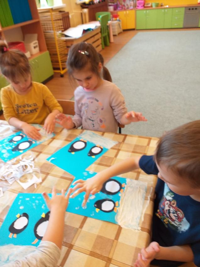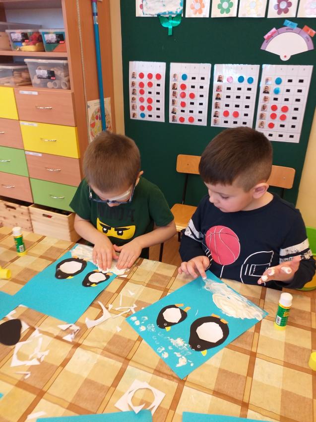 2022-02-08 Kotki wykonują pracę plastyczną "Zimowy spacer pingwinków"