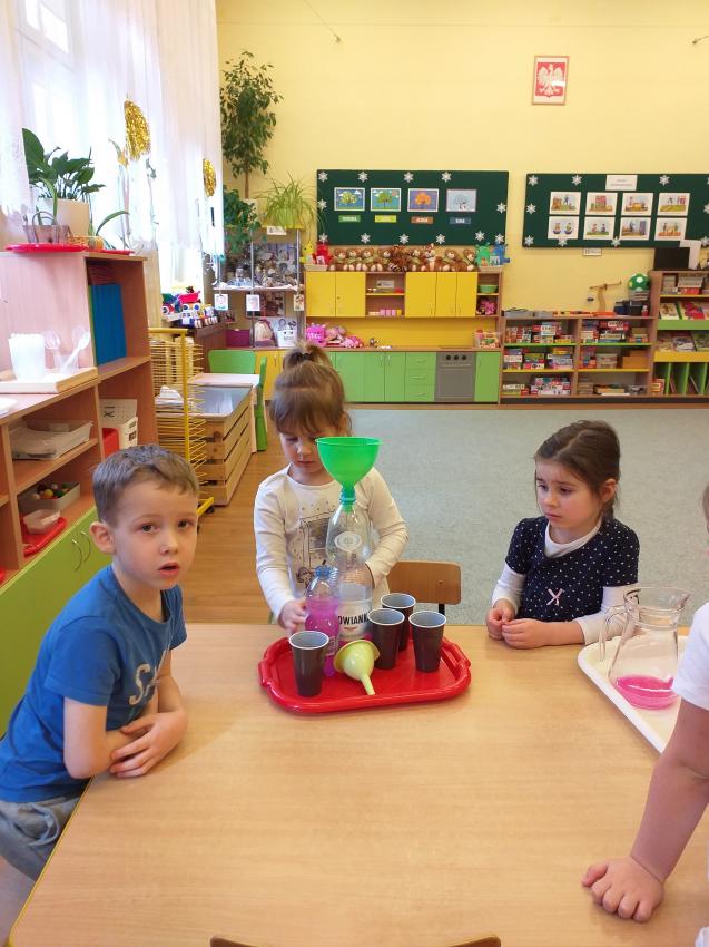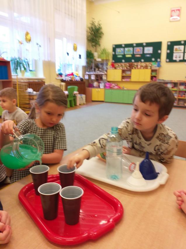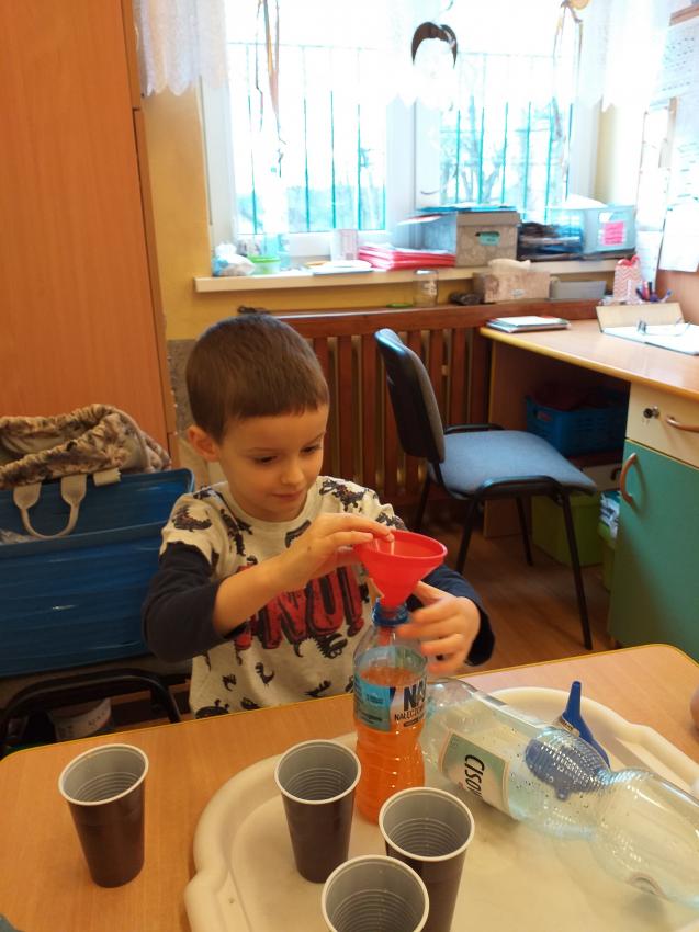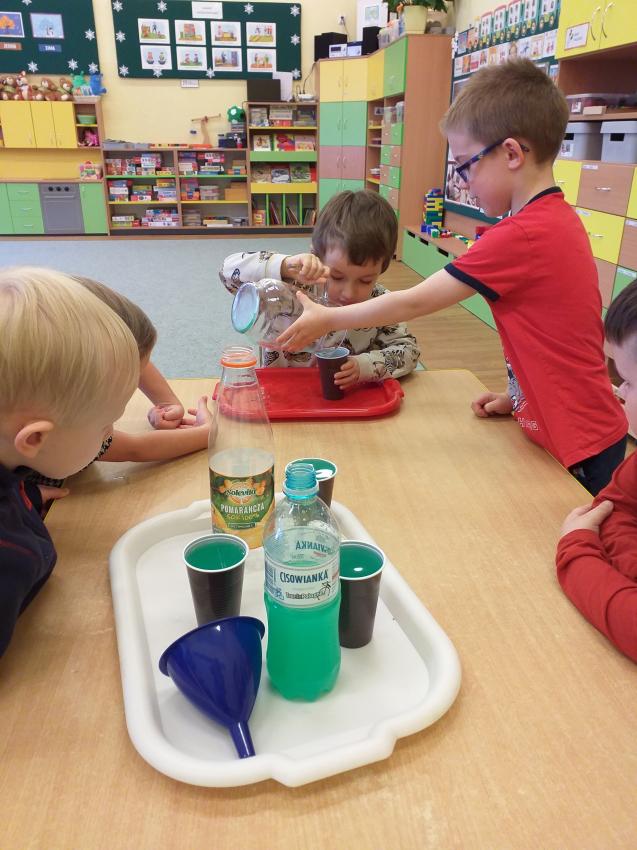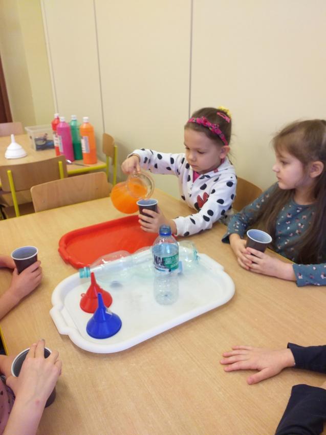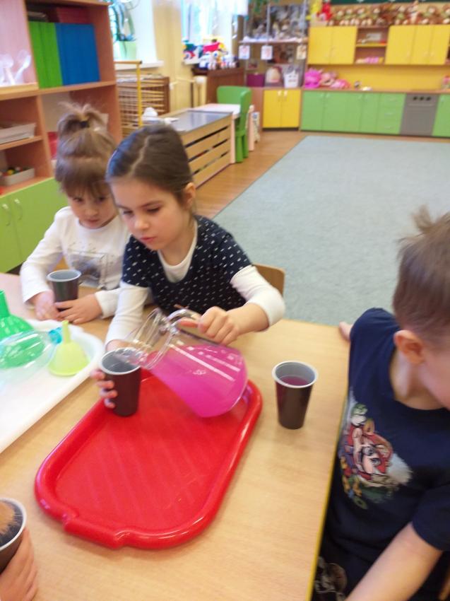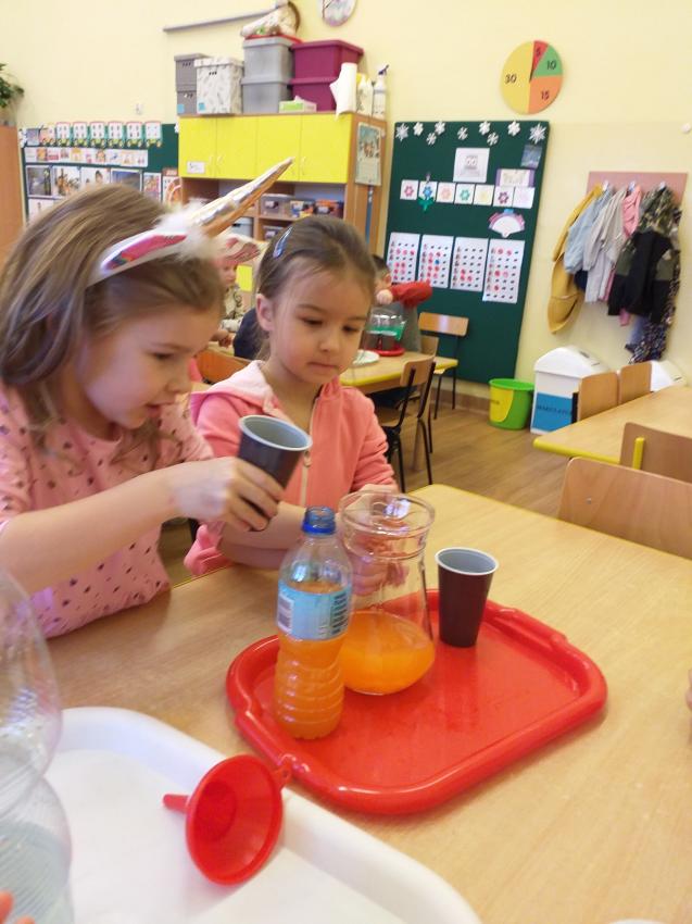 Dzieci przy okazji poznania zawodu barmana kształtują umiejętność szacunkowego porównywania płynów - "kolorowych soków". Bawią się świetnie: mierzą, szacują, przelewają i oceniają poprawność przygotowanej ilości płynu.