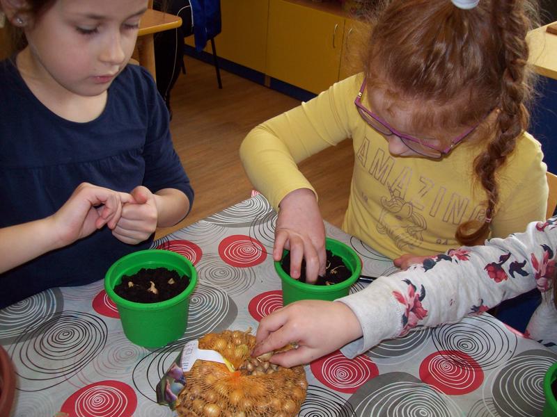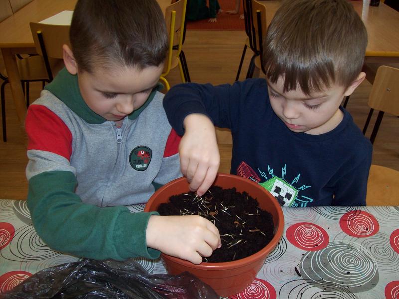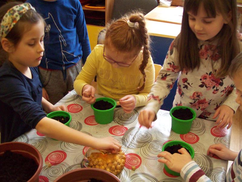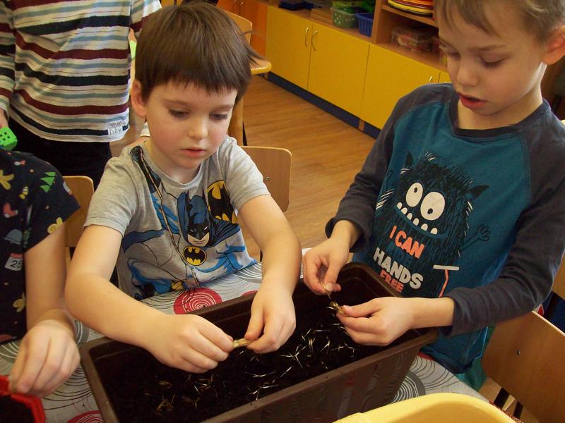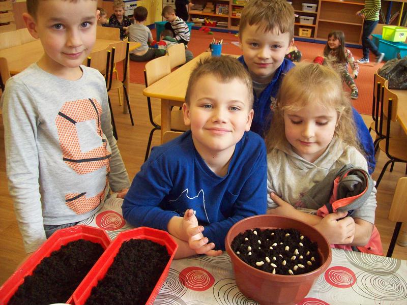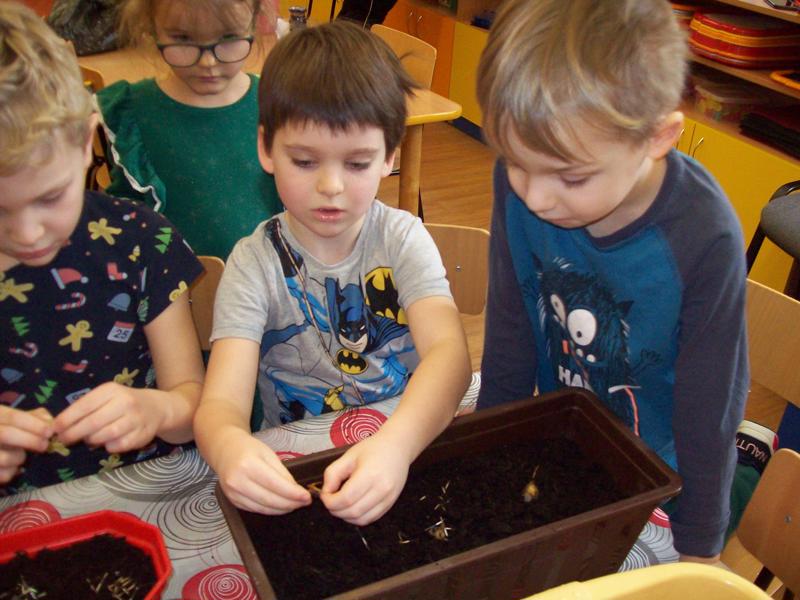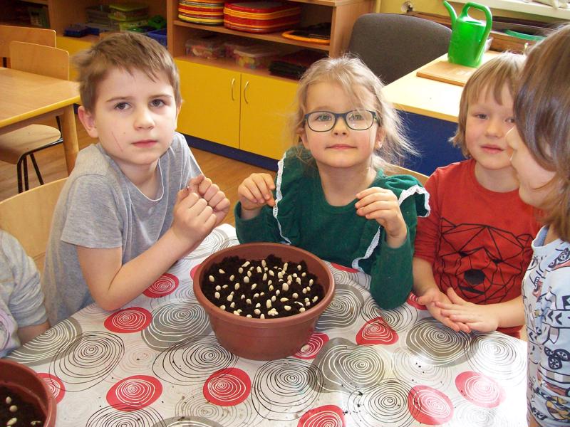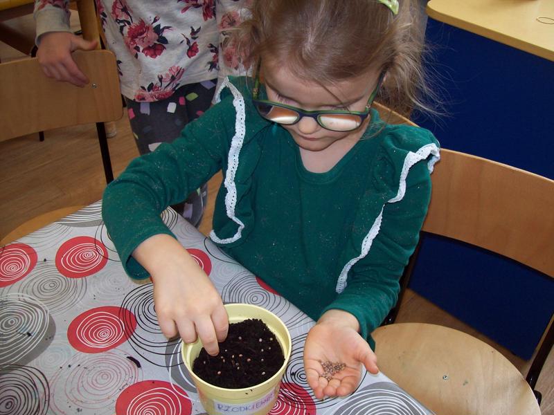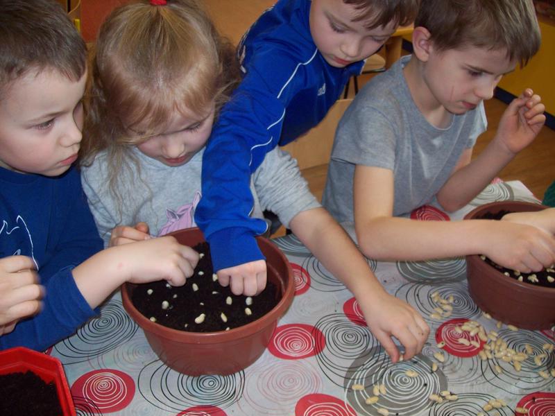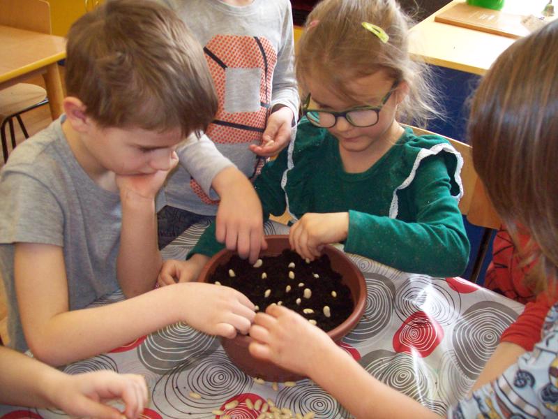 Dzieci z grupy Rybek będą prowadziły obserwacje hodowli, które dzisiaj założyły. Wsadziliśmy fasolkę, cebulkę, aksamitki, rukolę, bazylię, rzodkiewkę, koper. eraz czekamy na wzrost roślinek i małe plony.