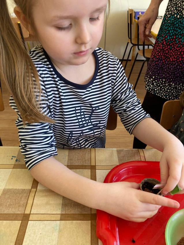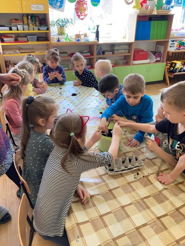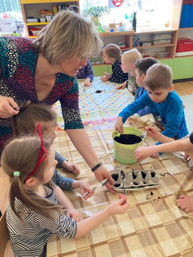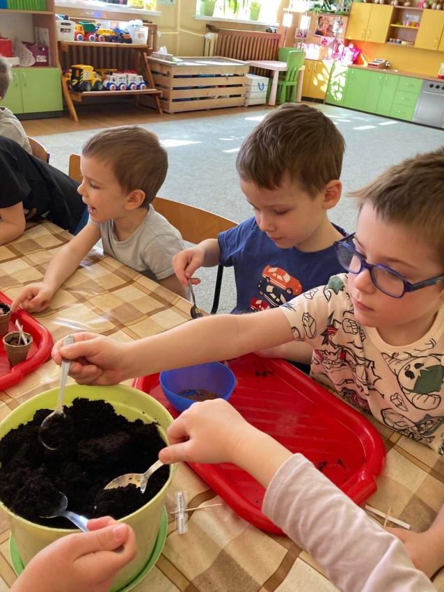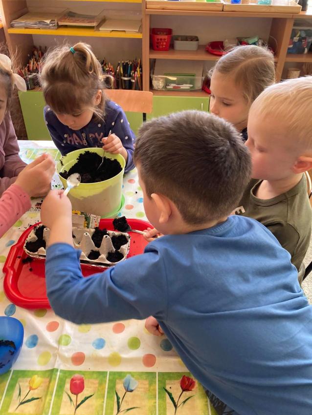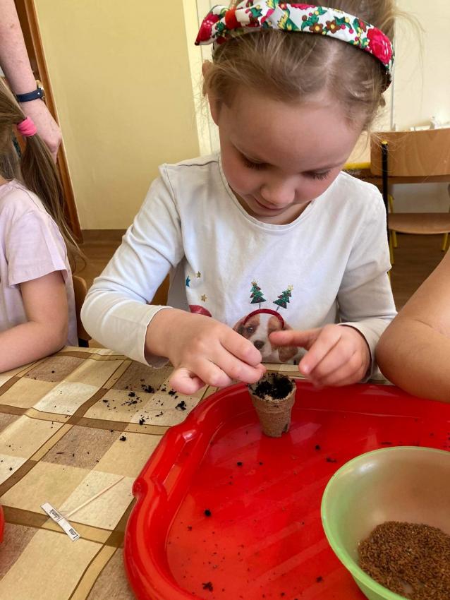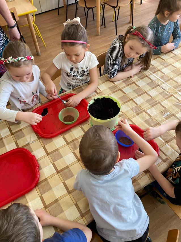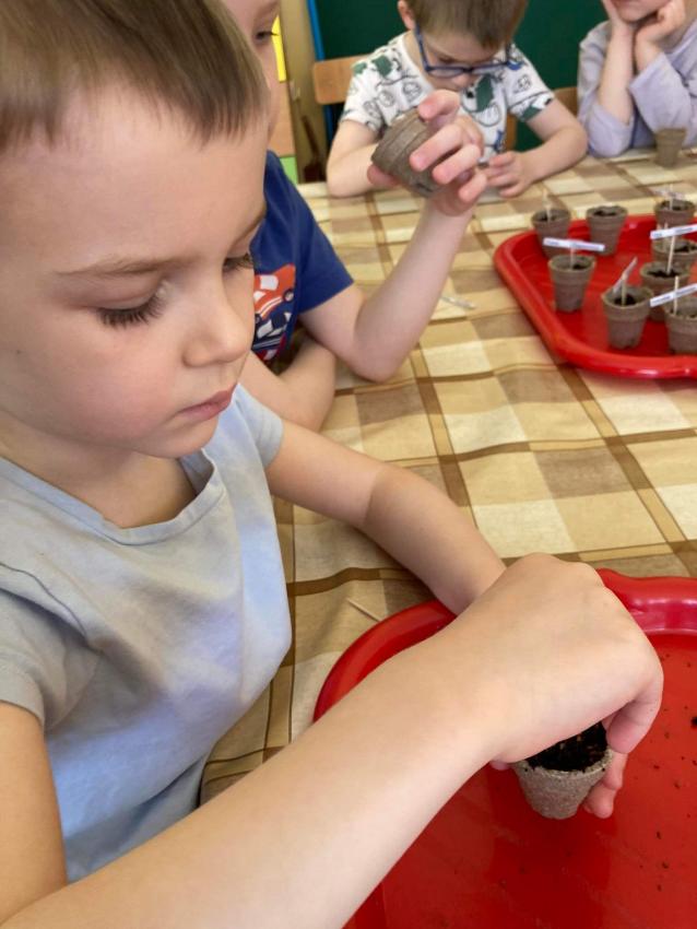 Przedszkolaki zapoznają się z etapami wzrostu roślin i czynnikami potrzebnymi do ich rozwoju. Dzieci z dyżym zaangażowaniem uczestniczą w samodzielnym wysiewaniu nasion.
