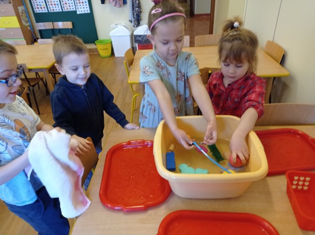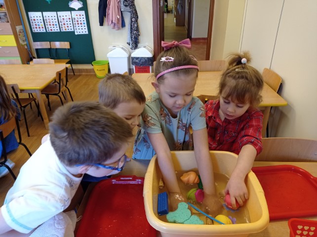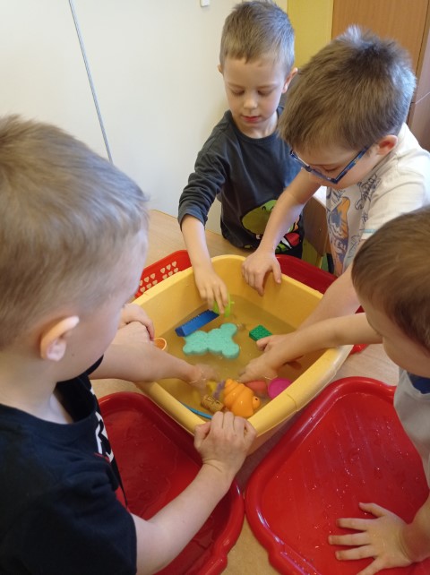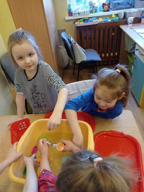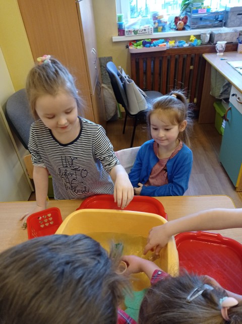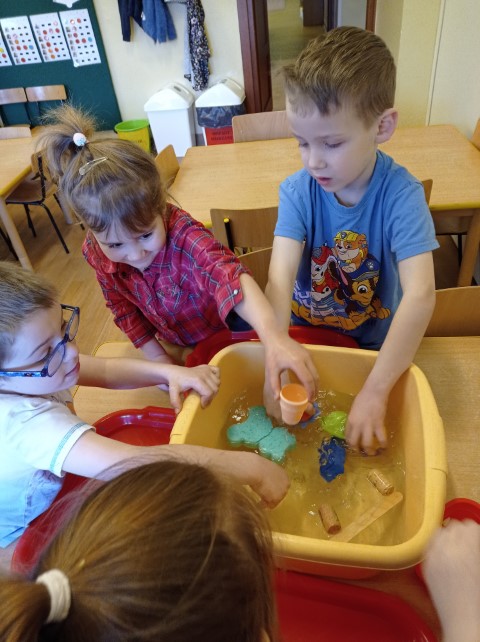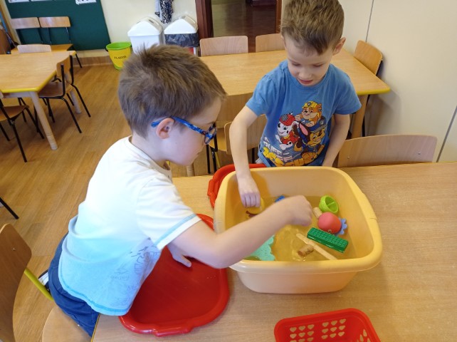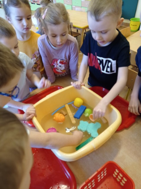 Dzieci w czasie wolnym rozwijają swoje zainteresowania. Tym razem oglądały na ilustracji różne przedmioty i zastanawiały się , które z nich będą pływać, a które nie. Potem postanowiły sprawdzić to w praktyce. Podczas zabawy dzieci bacznie obserwowały, jak zachowują się poszczególne przedmioty, i samodzielnie wyciągały wnioski.