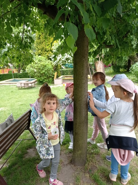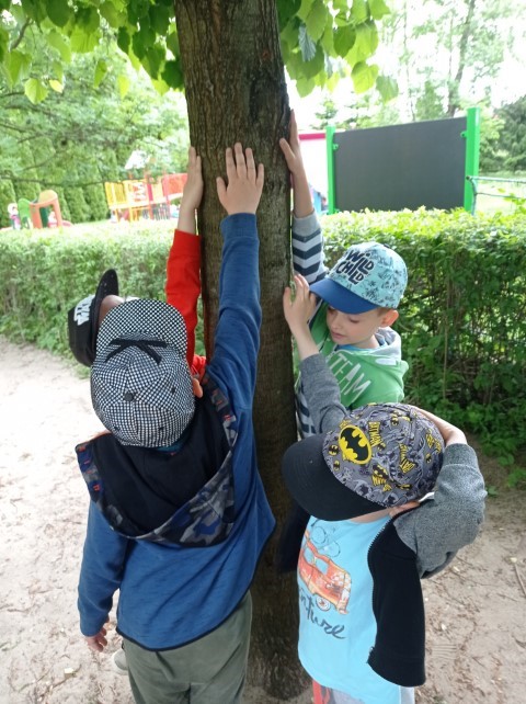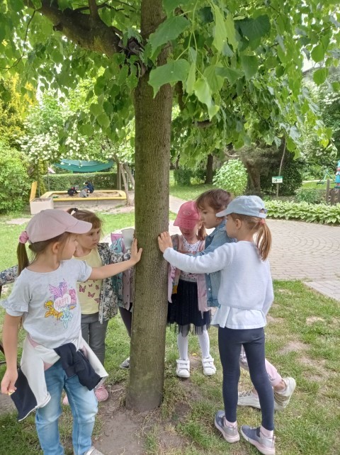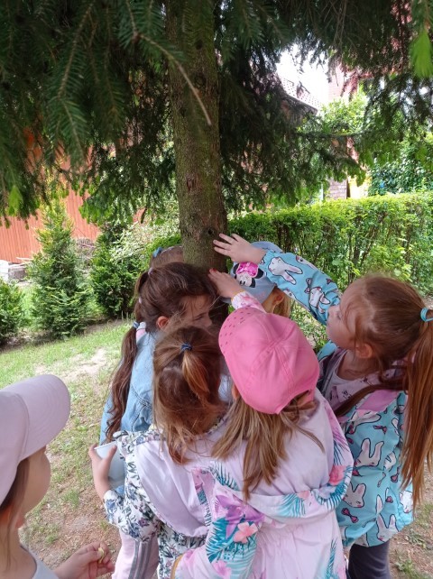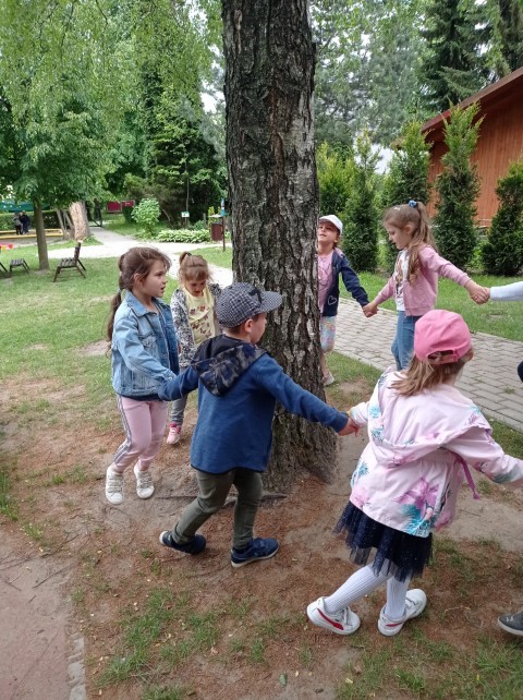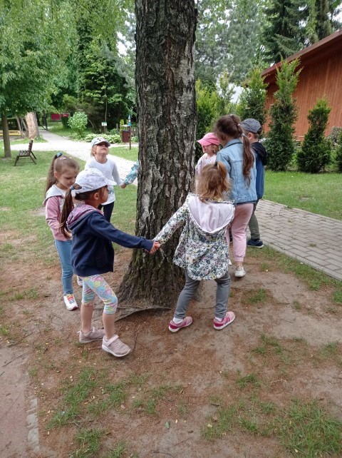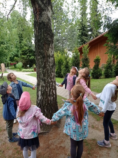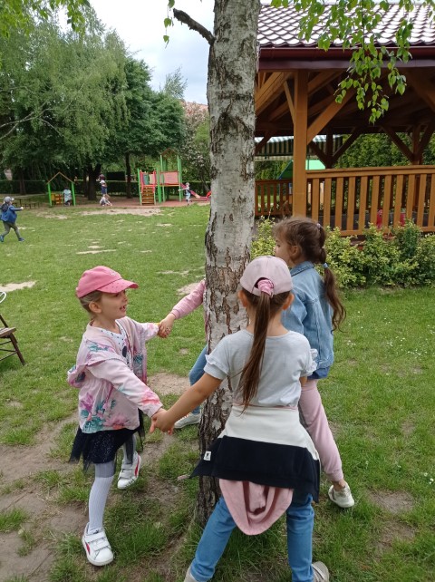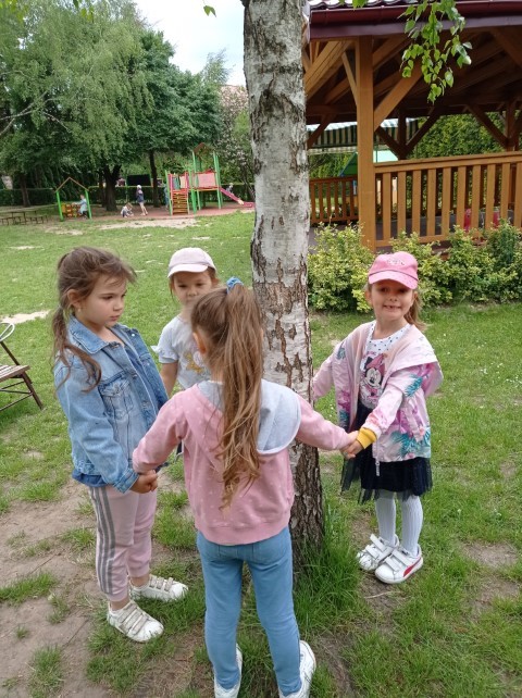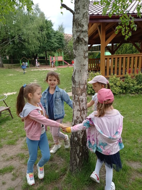 Nasz ogród jest miejscem pełnym zieleni; jest dużo drzew, krzewów i roślin, które sprawiają , że dzieci mogą w przyjaznym otoczeniu bawić się i wypoczywać. Dzieci z grupy ,,Kotków” prowadzą obserwację drzew i roślin w różnych porach roku (szczególnie lubią brzozy), a także starają się zapamiętać nazwy wybranych drzew, krzewów i roślin.