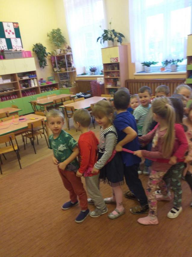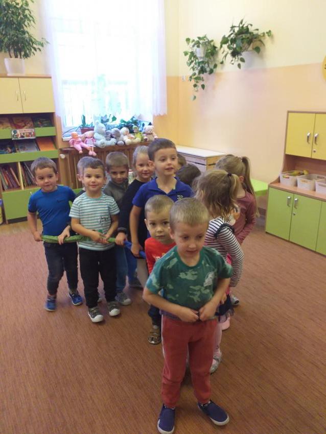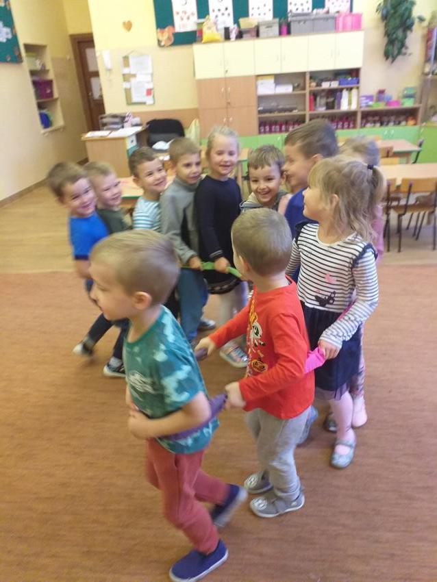Przypominamy kształty figur geometrycznych i w małych grupach kontynuujemy rytmy. W zabawie ruchowej jedziemy autobusem. Na umówiony znak skręcamy w prawo lub w lewo.