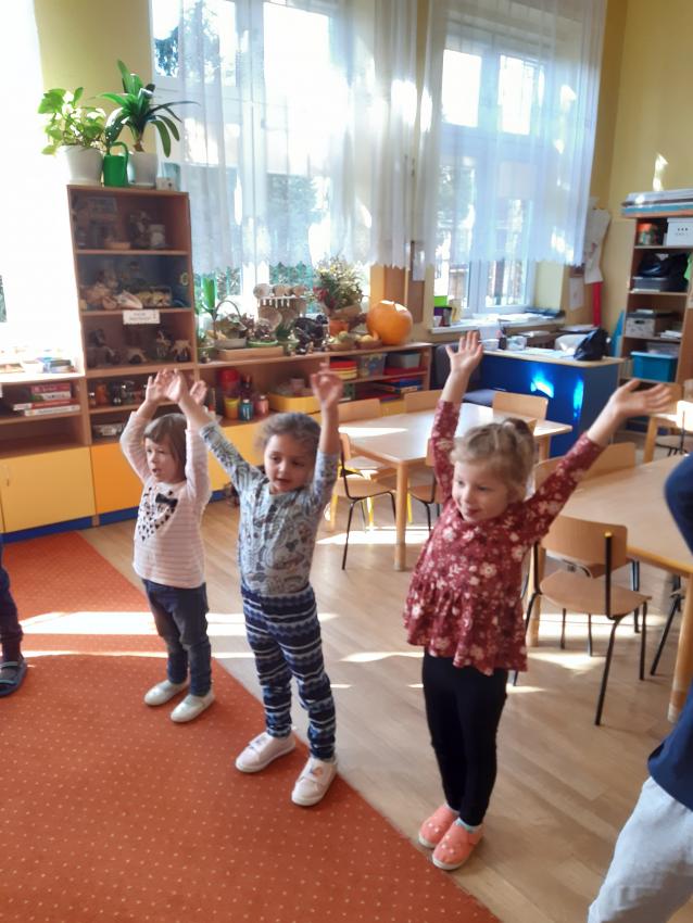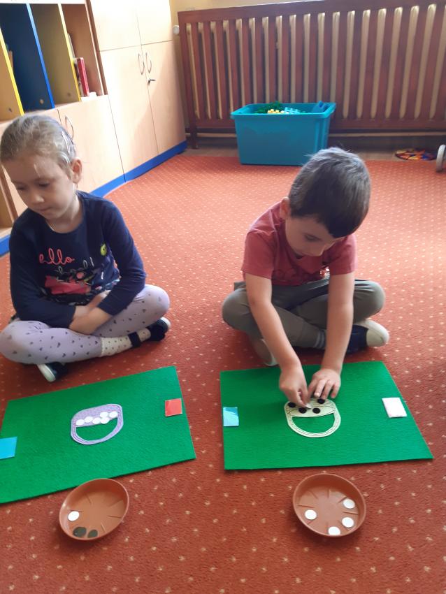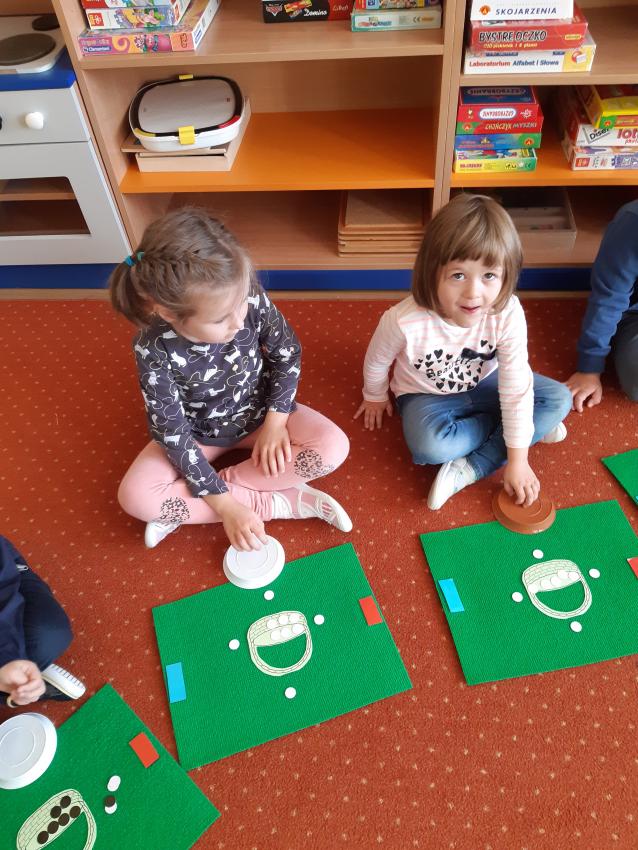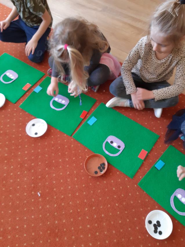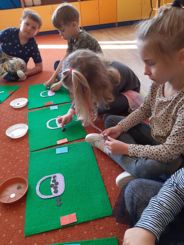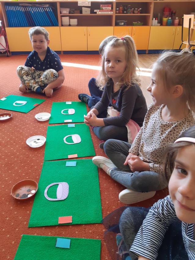 Podczas zajęć matematycznych dzieci przeliczały, porównywały liczebność zbiorów w koszyczku, doskonaliły umiejętności orientacji w stronach (lewa, prawa, góra ,dół). Dodawały i odejmowały na konkretach.