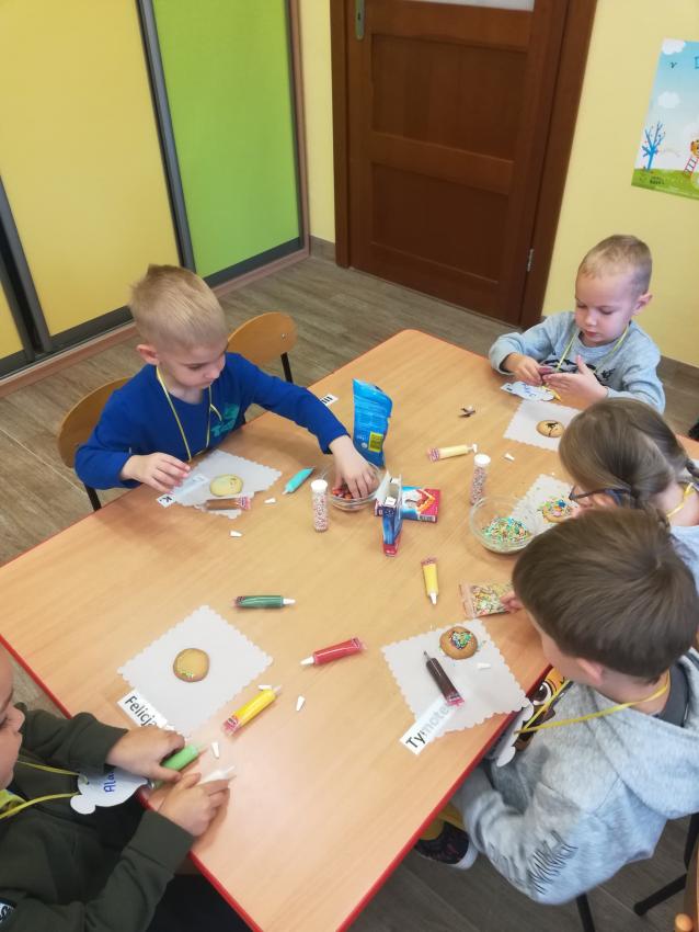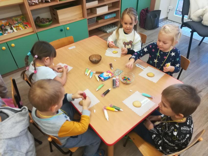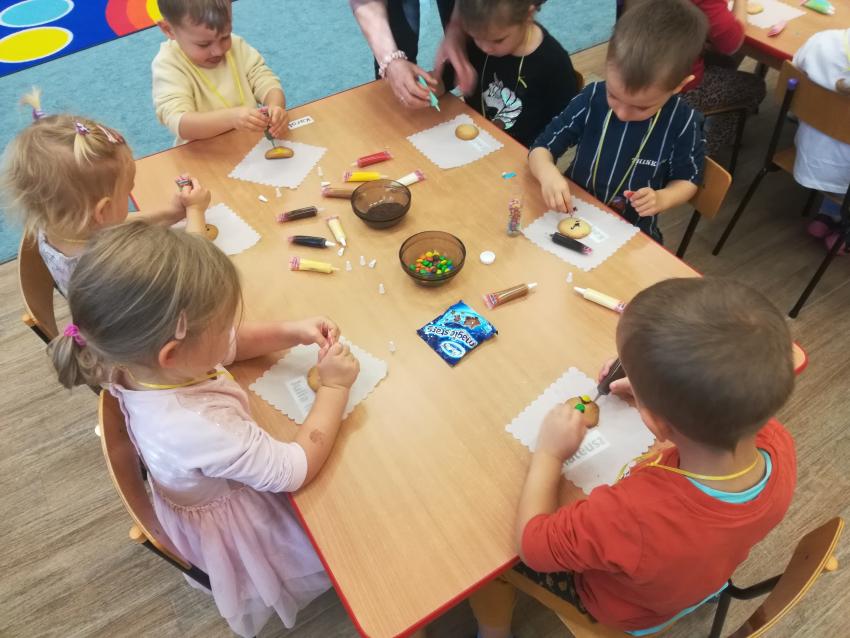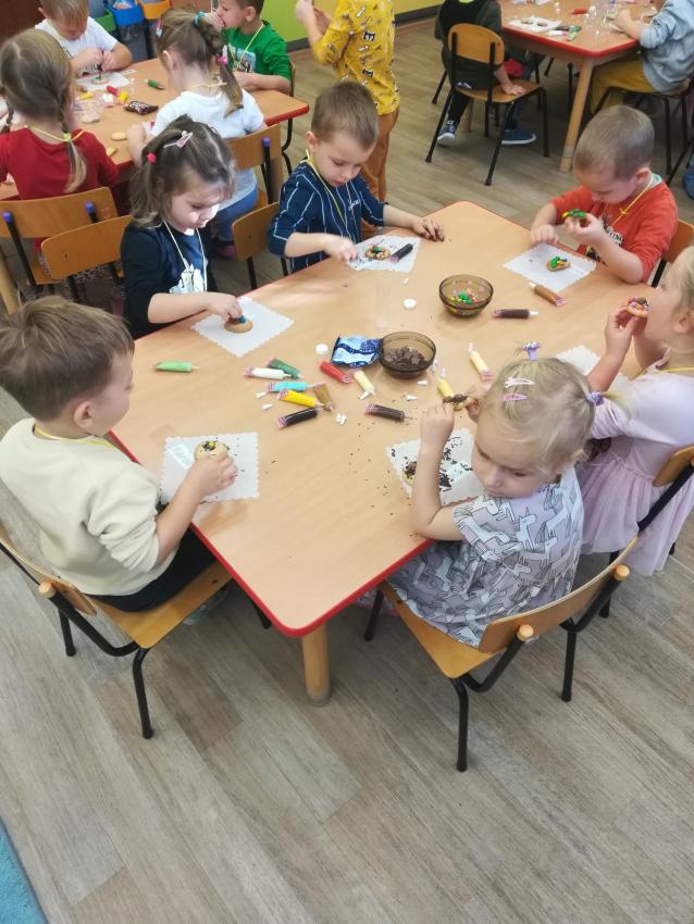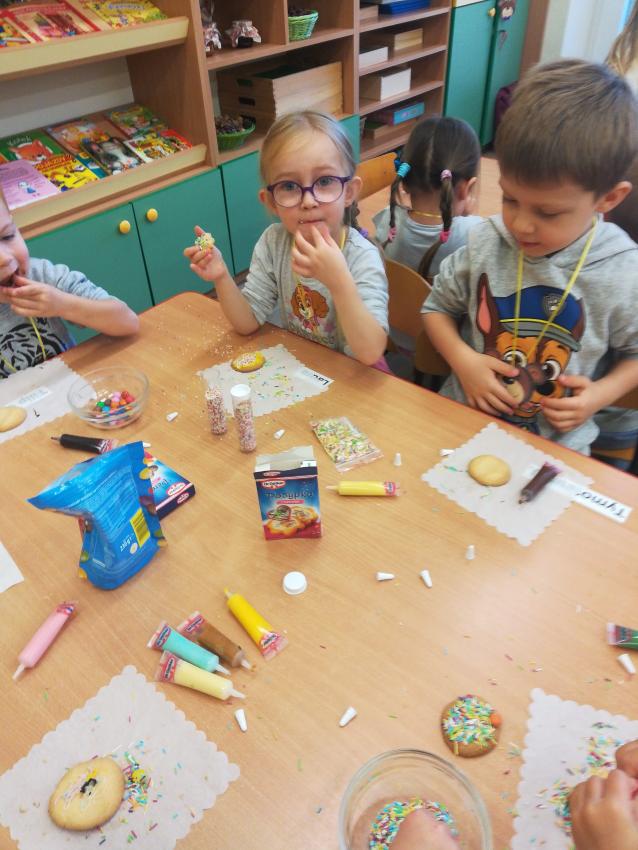 Dzisiejszy dzień był pełen emocji i wrażeń. Żabki obchodziły Dzień Pluszowego Misia. Były tańce i zabawy, a na koniec mała niespodzianka - Misiowe ciasteczka, które dzieci same dekorowały, a potem z ochotą zjadały :)