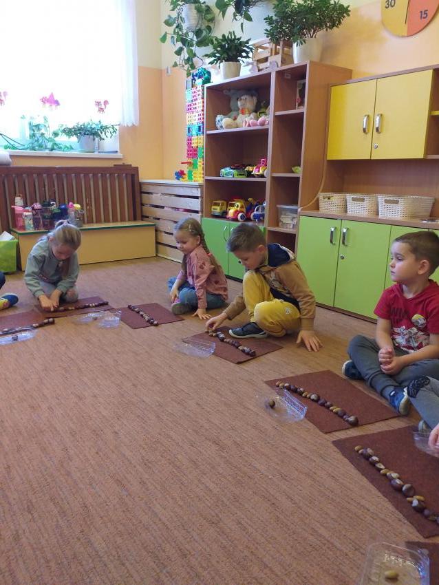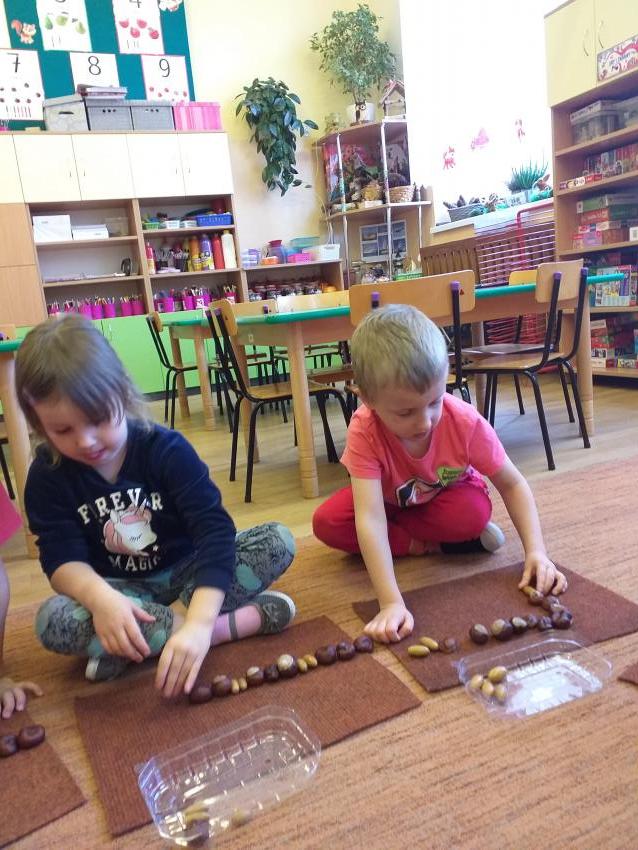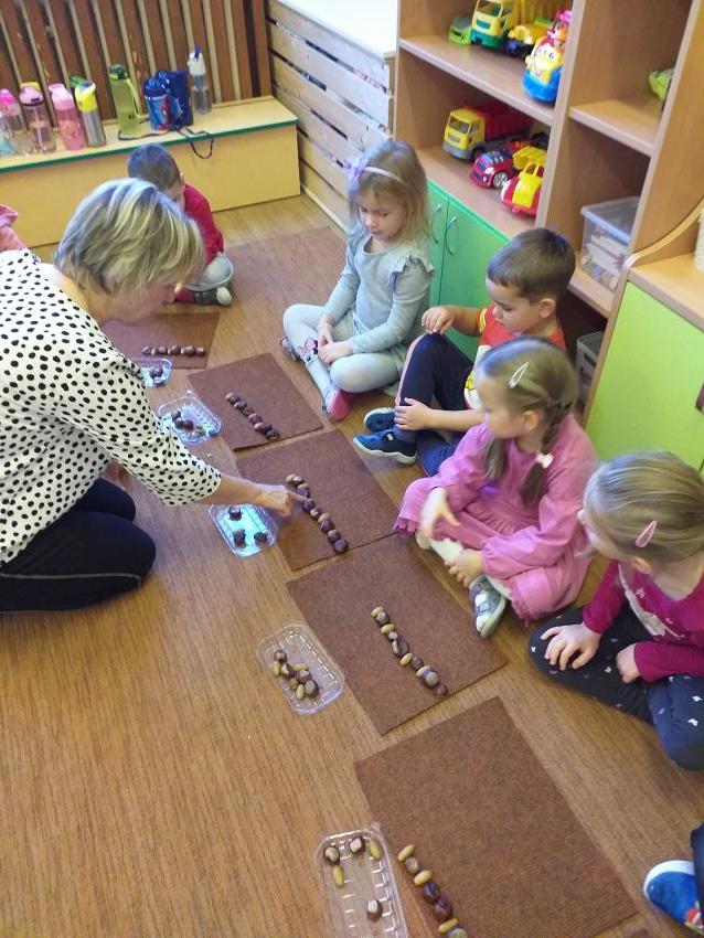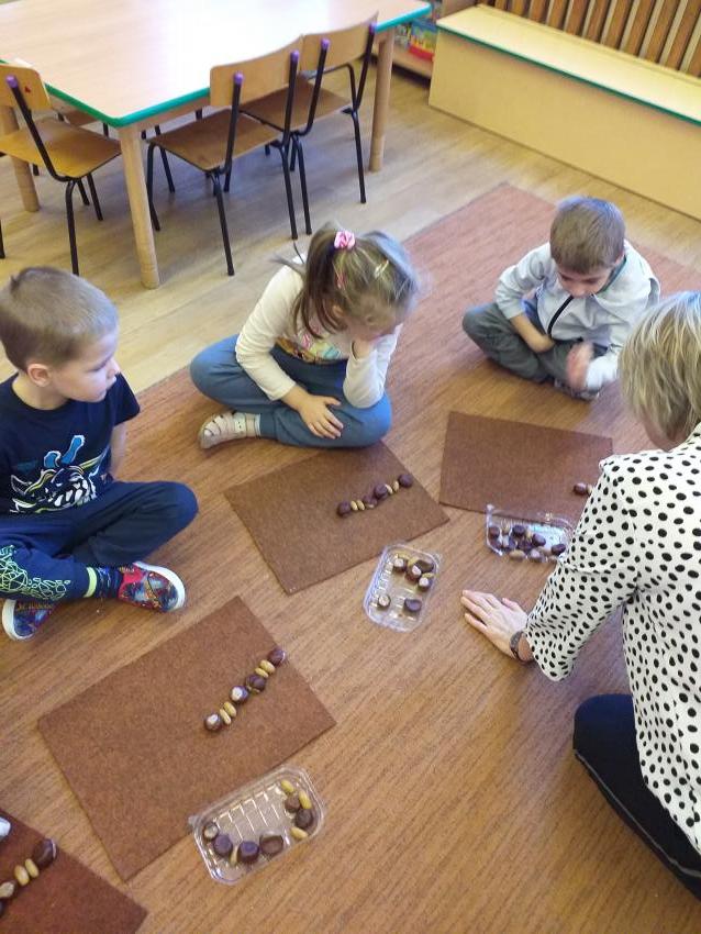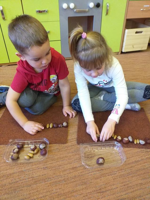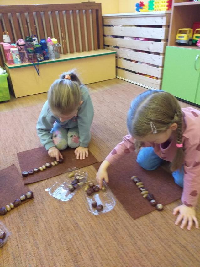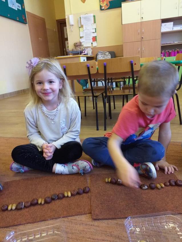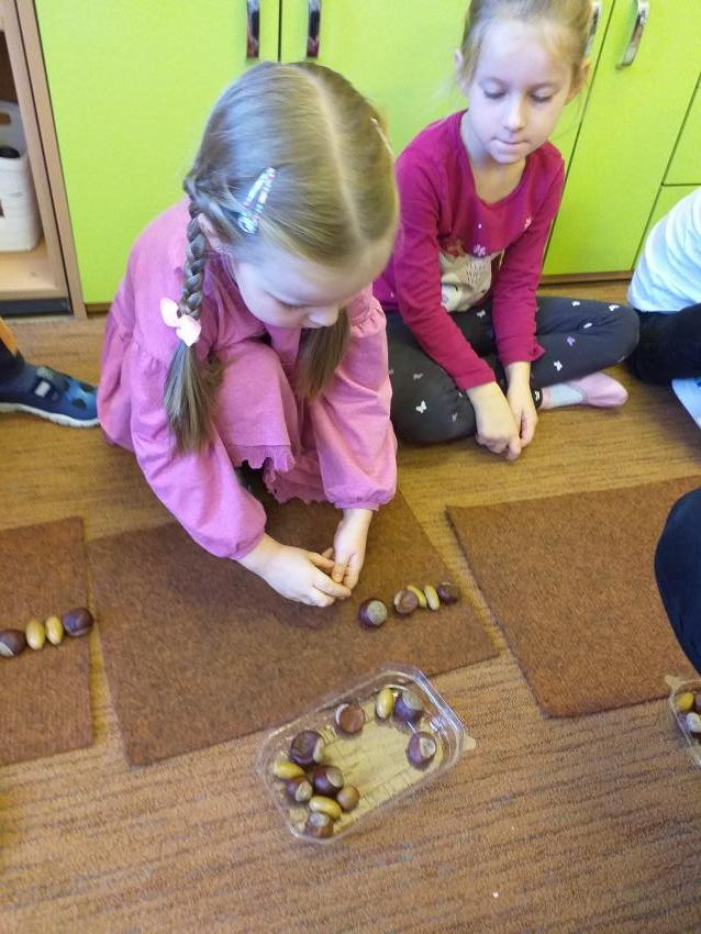 W zabawie matematycznej Jesienne rytmy rozwijamy umiejętności odwzorowywania szeregów rytmicznych. Wykorzystujemy jesienne dary w postaci kasztanów i żołędzi.