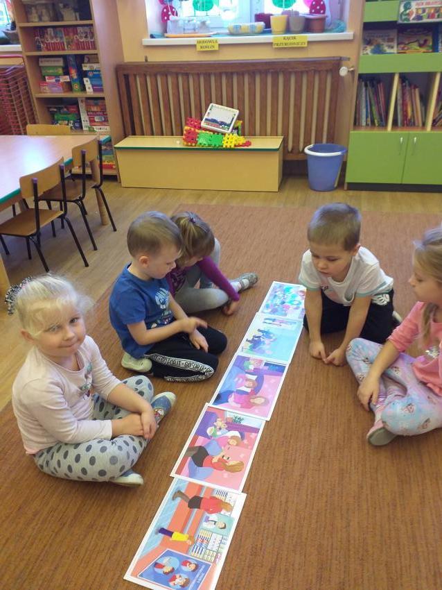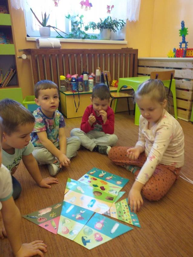 Układamy historyjki obrazkowe w małych grupach, poznając zasady zdrowego trybu życia.