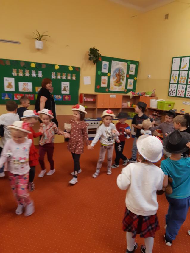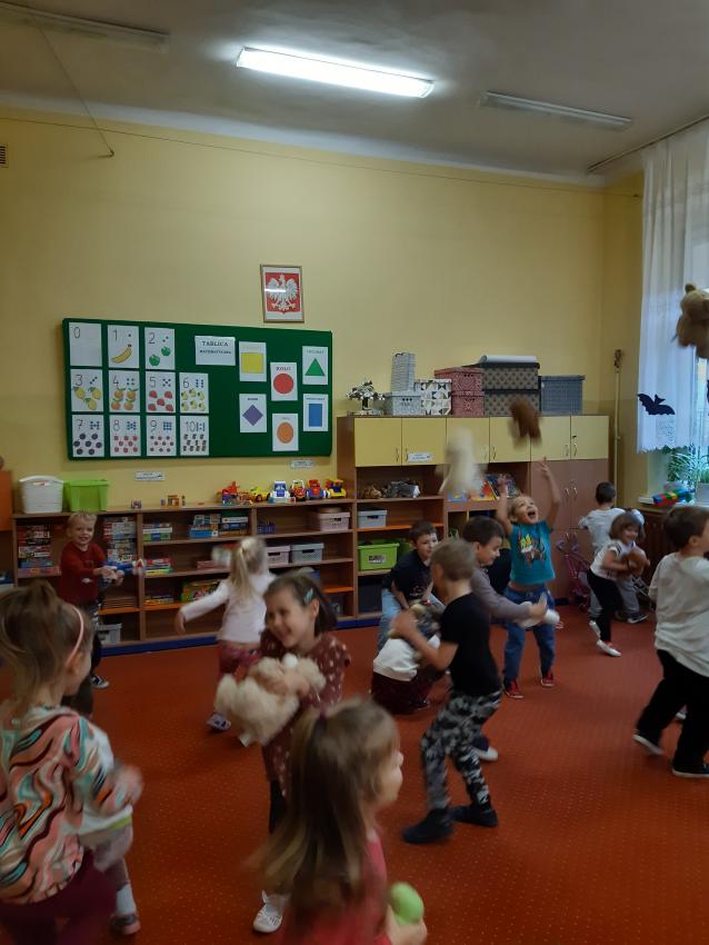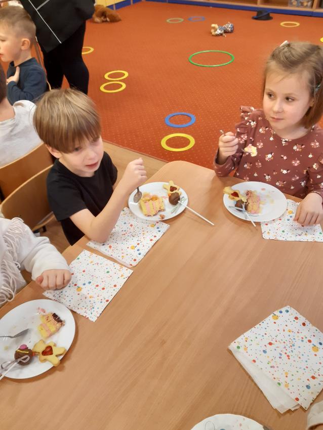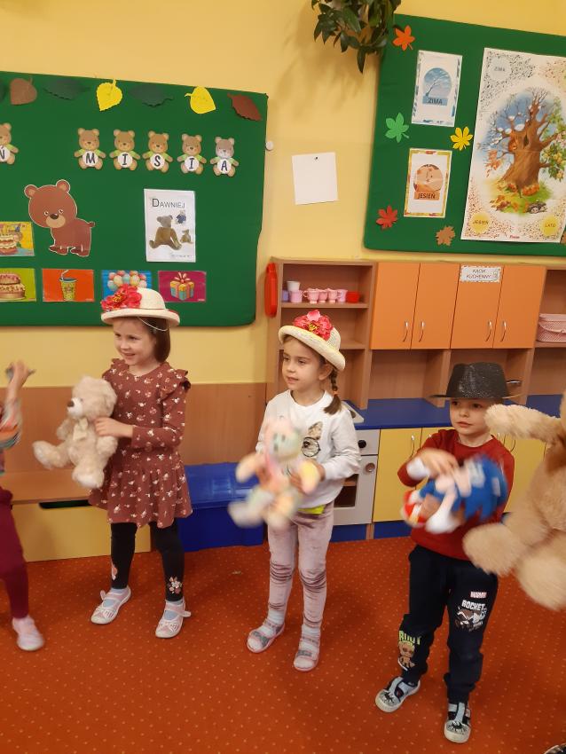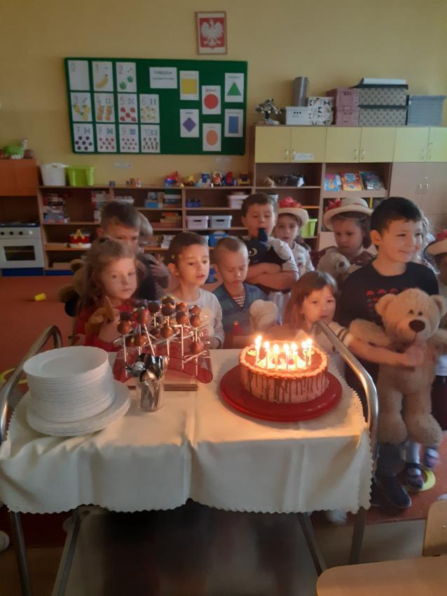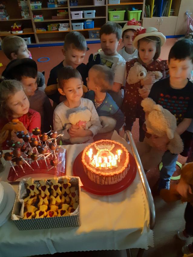 Miś to przyjaciel każdego dziecka .W tym dniu świętowaliśmy wspólnie Jego urodziny .Dzieci przyniosły swoje ukochane pluszowe zabawki z którymi wspaniale się bawiły , rozwiązywały zadania, zagadki.Były tańce, skakańce,i misiowe kołysanki .Nie zabrakło też tortu urodzinowego skonstruowanego przez każdego uczestnika zabawy dla swojego pluszaka , torty powstały z kolorowych plastikowych kubeczków. Dla wszystkich dzieci był też wspaniały smakowity tort przygotowany przez Babcię Julki ,oraz pyszne ciasteczka i "misiowe "lizaczki przygotowane przez Mamusię Antosia . Serdecznie dziękujemy za zaangażowanie Rodzin w przygotowanie uroczystości .