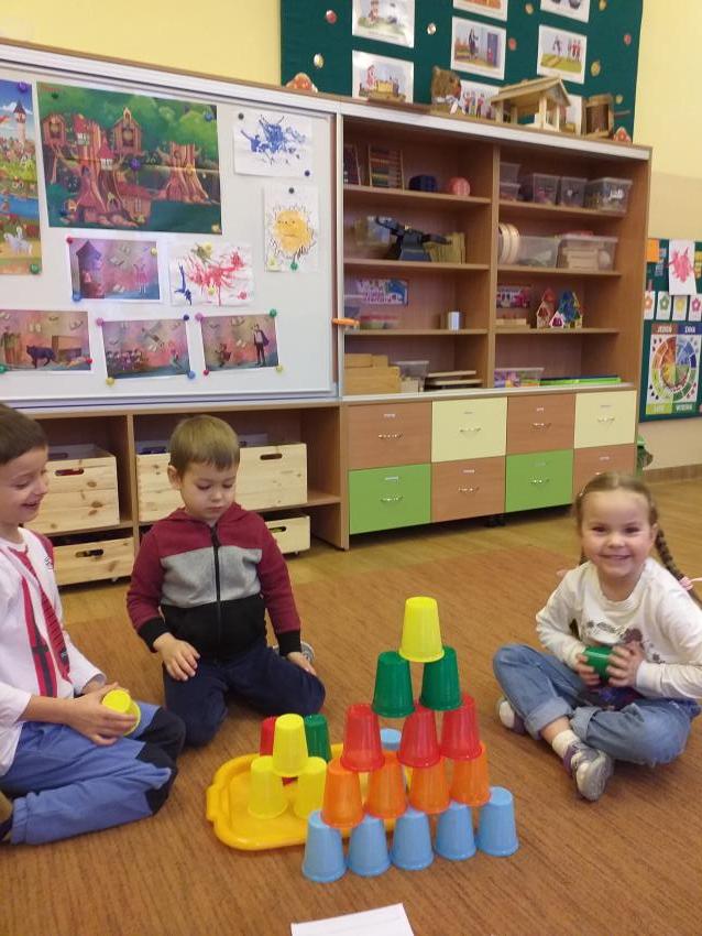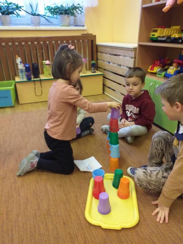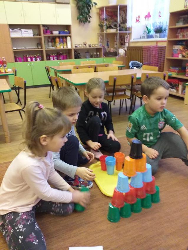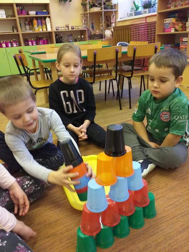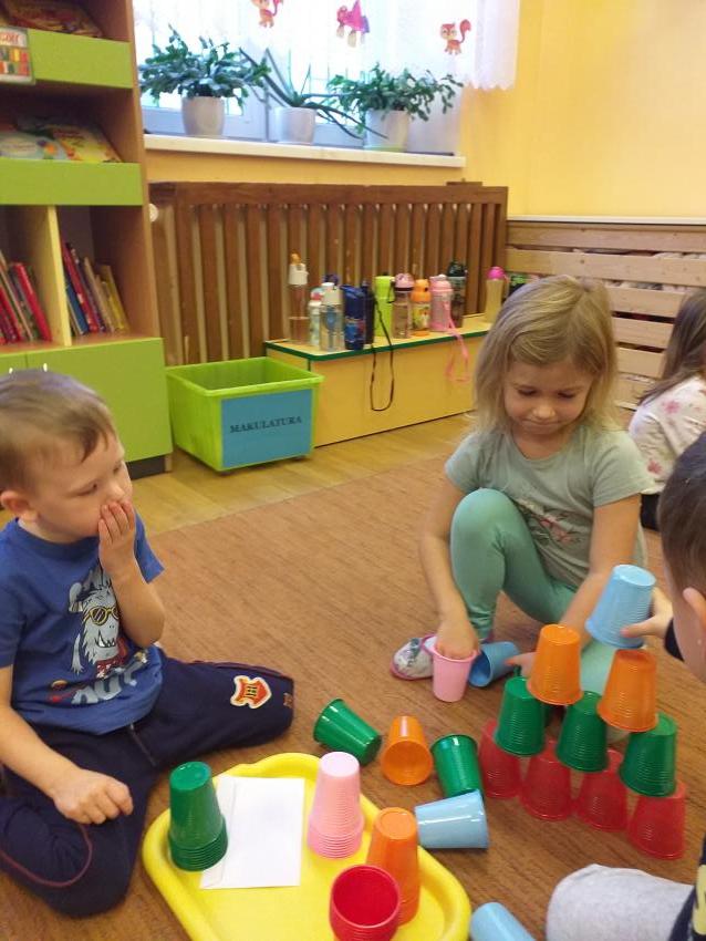Zgodnie współpracujemy w małych zespołach. Odczytujemy podany kod i układamy wzór z kolorowych kubków.