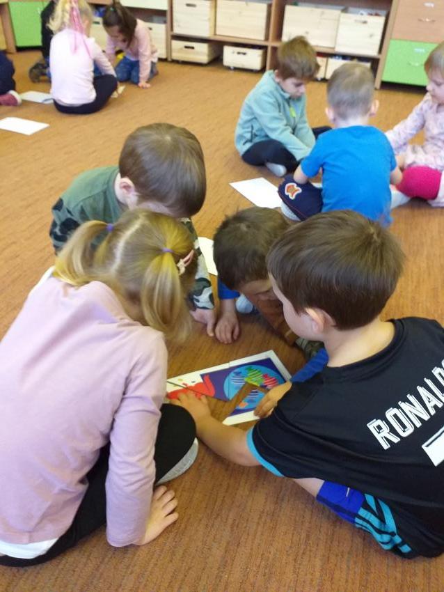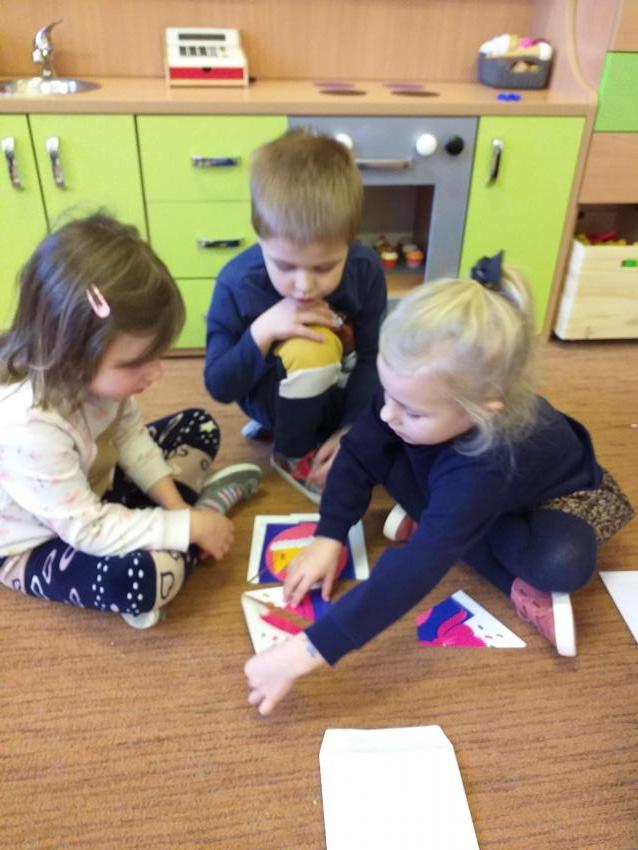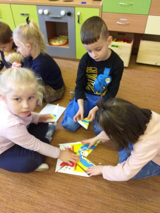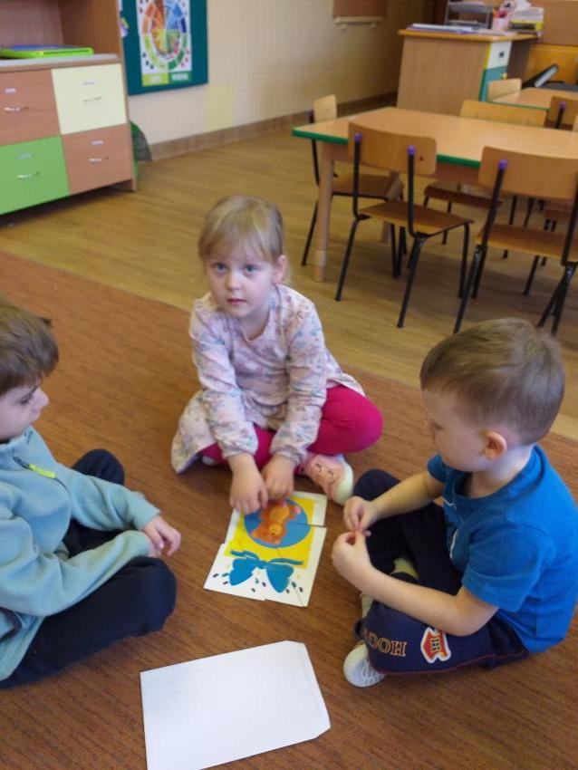Układamy obrazki pocięte na części rozwijając koncentrację i pamięć wzrokową. Dzielimy się swoimi umiejętnościami z koleżankami i kolegami z grupy.