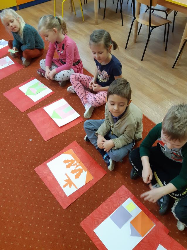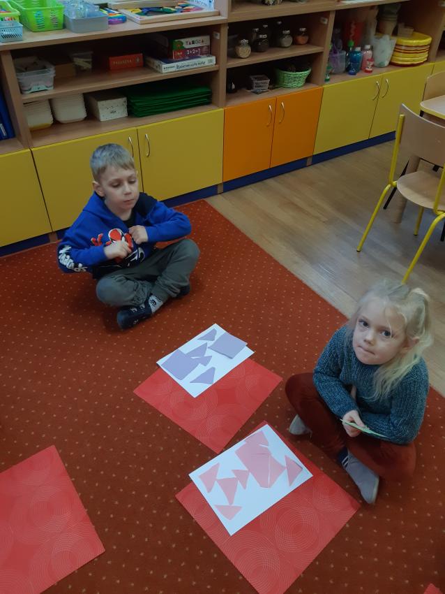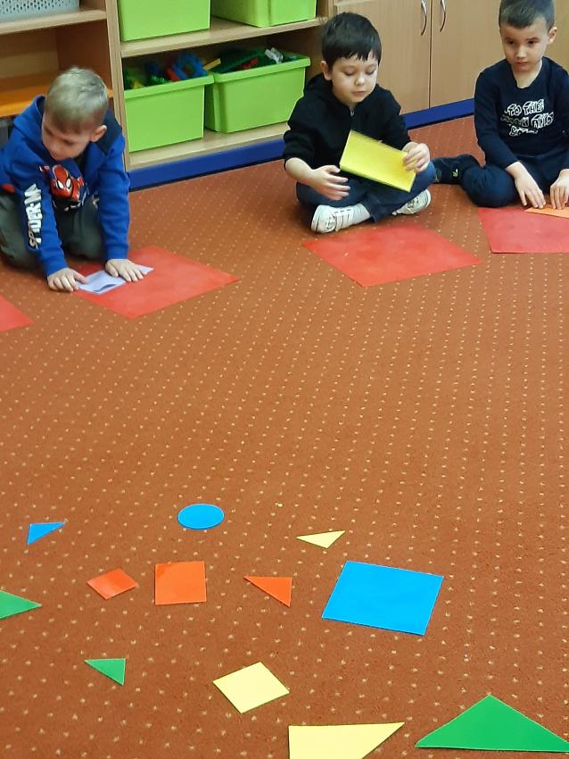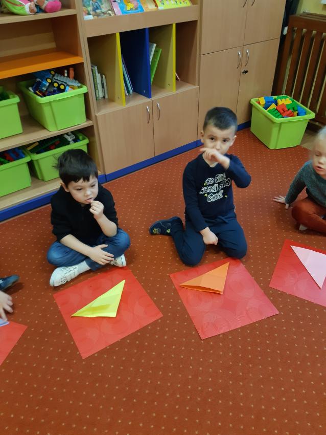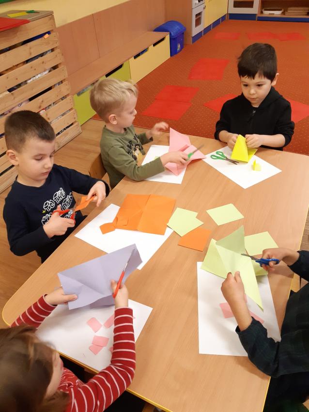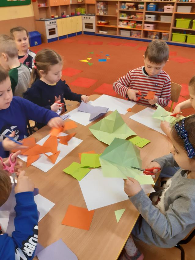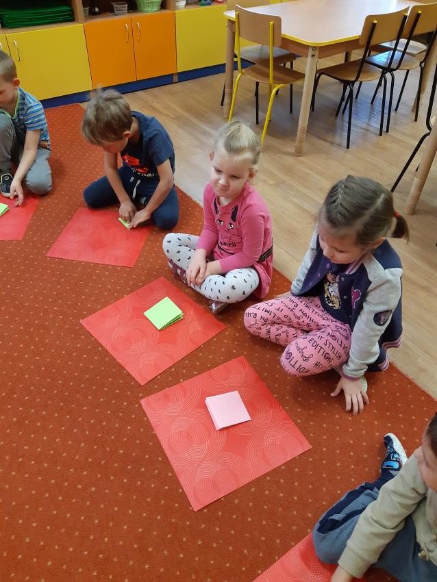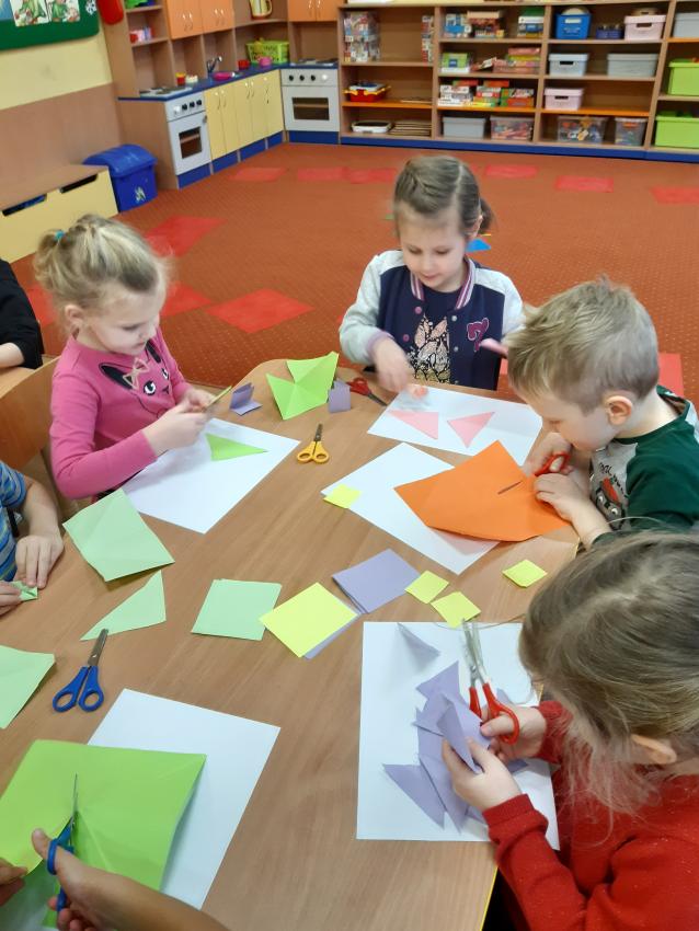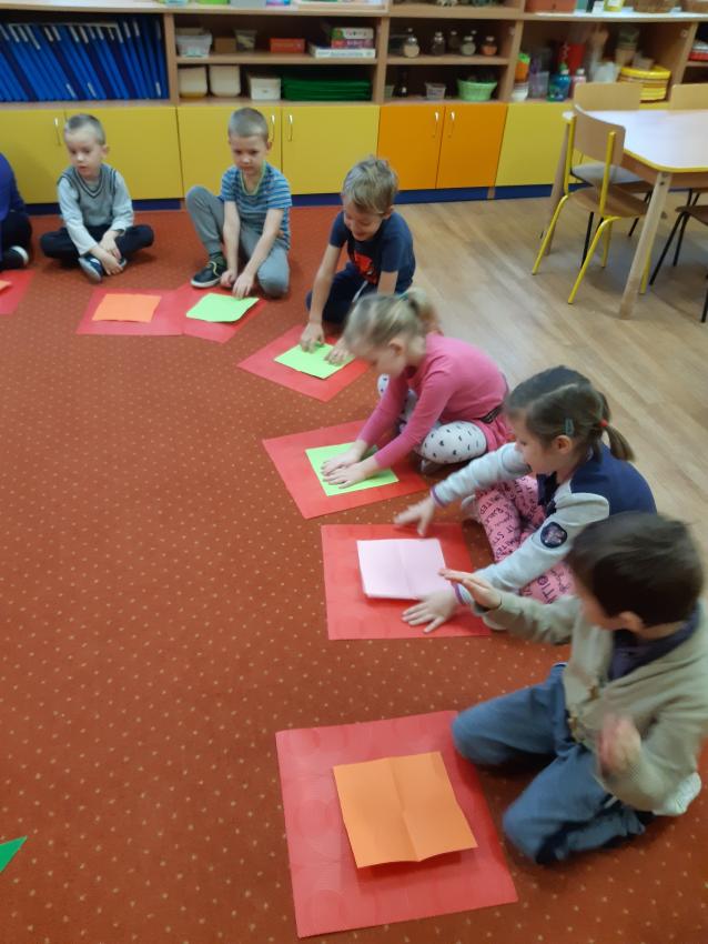 Podczas zajęć dzieci dowiedziały się jakie figury geometryczne mogą powstać z kwadrata. Samodzielnie wg instrukcji nauczyciela składały papierowy kwadrat uzyskując inne figury . Przeliczały, porównywały wielkość powstałych figur. Następnie wycinały powstałe figury i tworzyły obrazek wg własnego pomysłu.