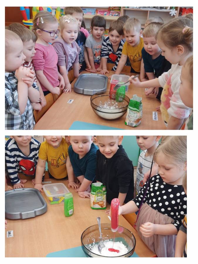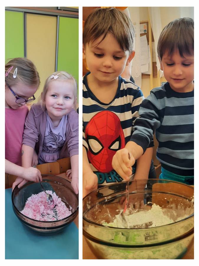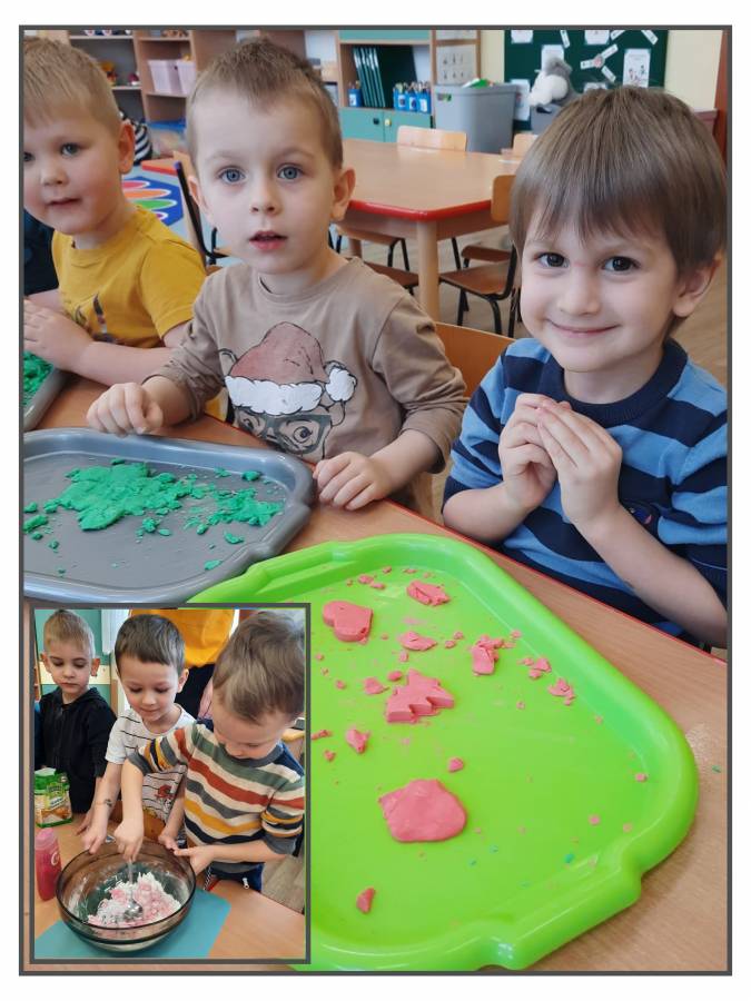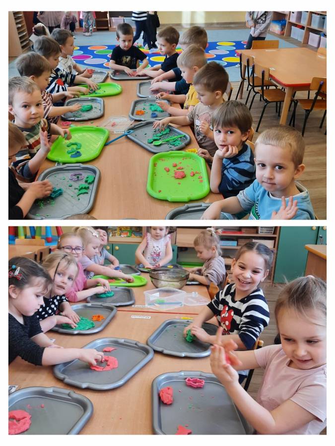 Uwieńczeniem naszych zajęć było wspólne wykonanie masy sensorycznej. Dzieci z kolorowej i pachnącej oraz miłej w dotyku masy wykonały różne modele i kształty. Ta aktywność pobudziła nie tylko zmysły czy wyobraźnię ale także pozwoliła na doskonalenie małej motoryki.