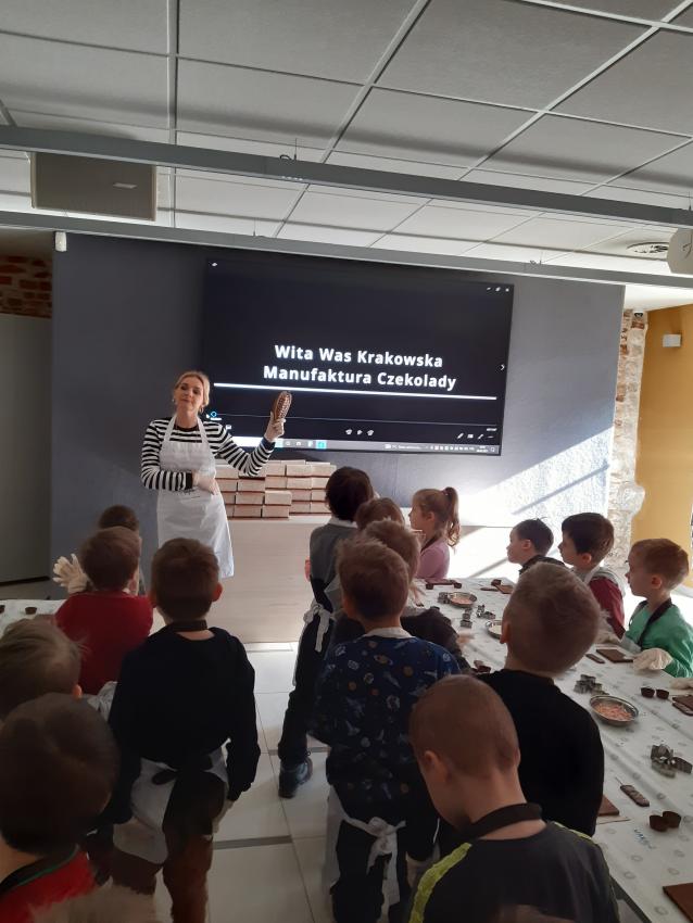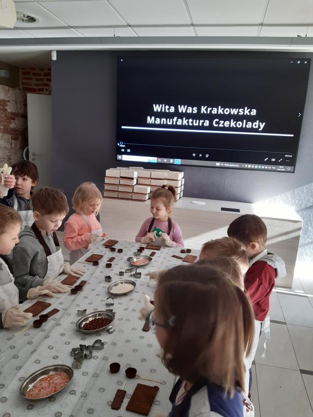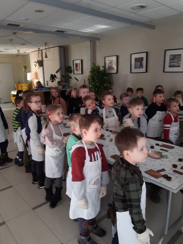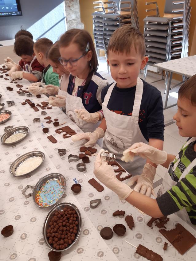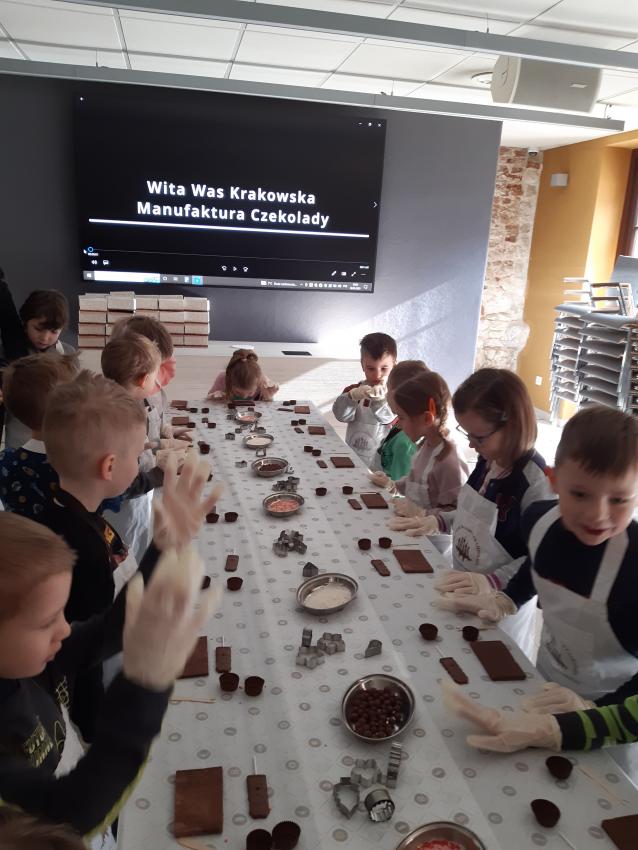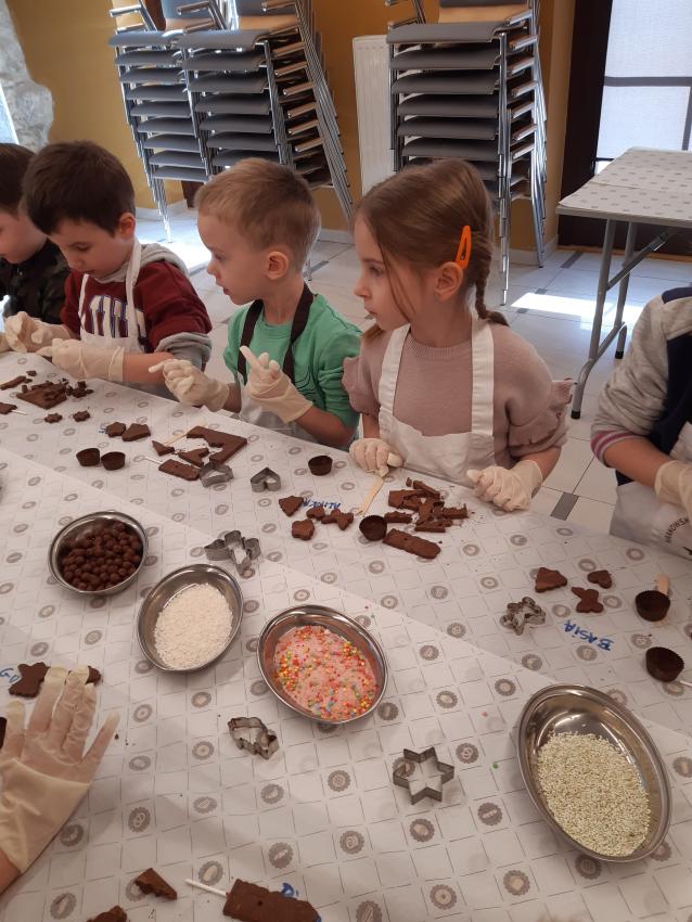 Podczas warsztatów dzieci miały możliwość poznać historię powstania czekolady oraz proces produkcji czekolady od ziarenka kakaowca do tabliczki czekolady . Zapoznały się również z zawodem cukiernika .Dzieci samodzielnie wykonały czekoladowe pralinki, które pięknie dekorowały przygotowanymi posypkami . Było słodko , bardzo słodko .