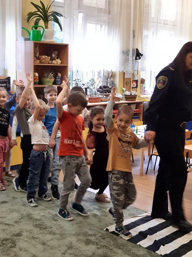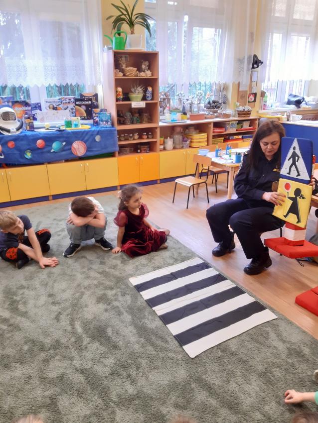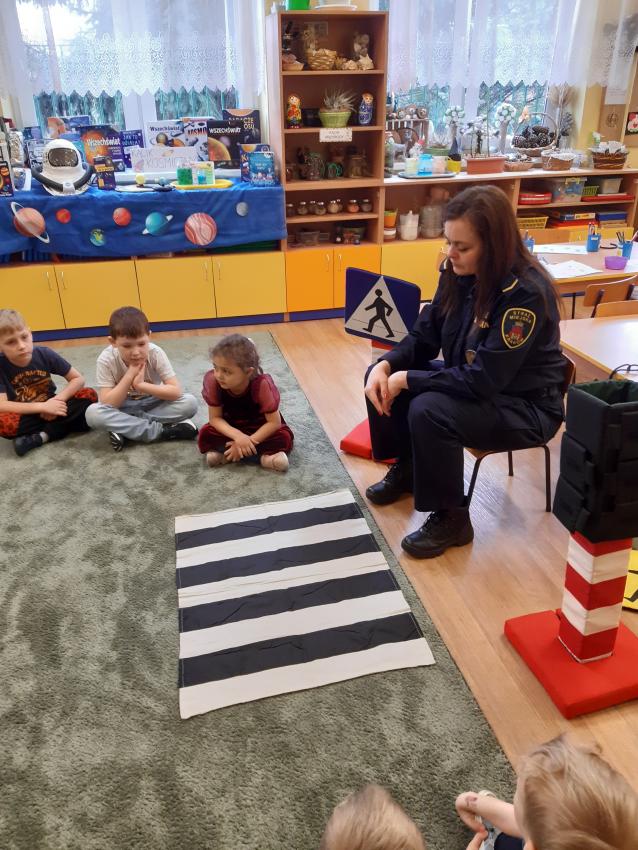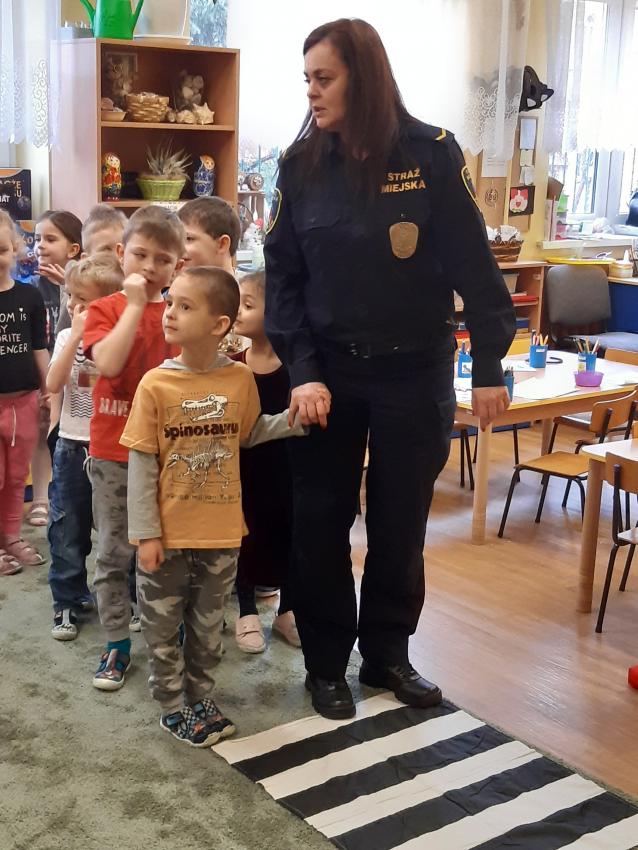 Podczas spotkania dzieci przypomniały zasady bezpieczeństwa w ruchu drogowym , poznały funkcję i zadania jakie pełni Straż Miejska .