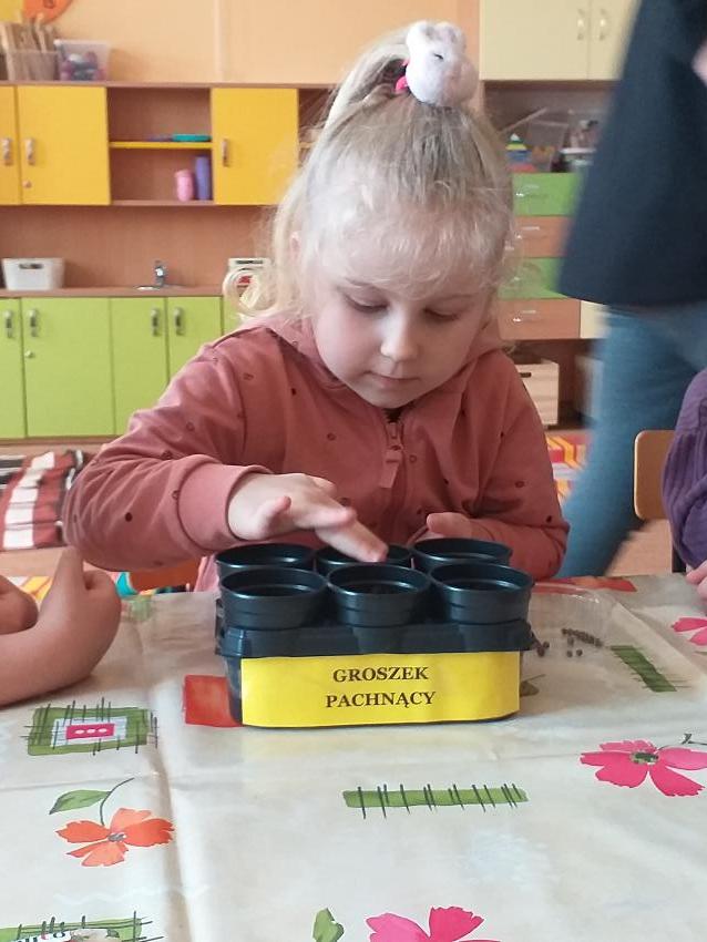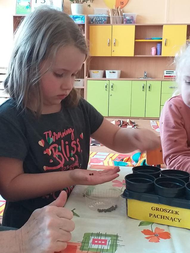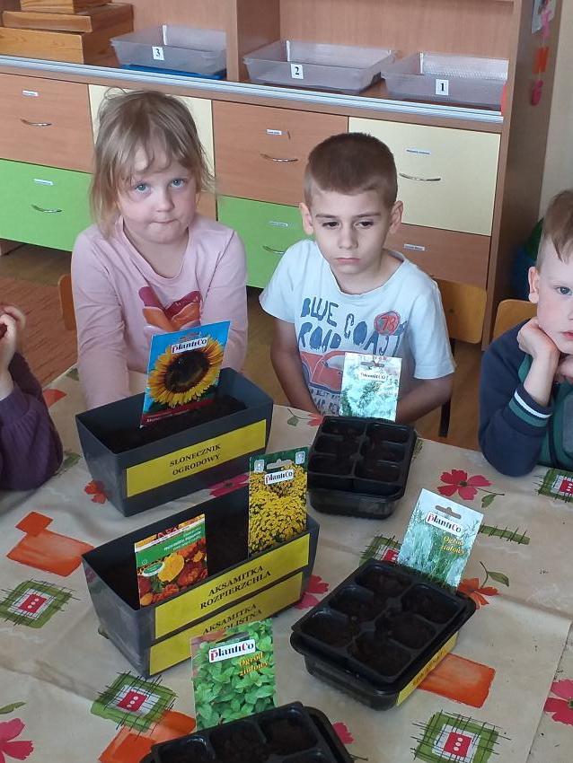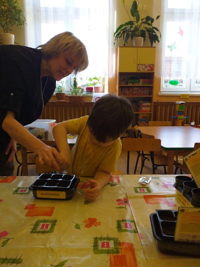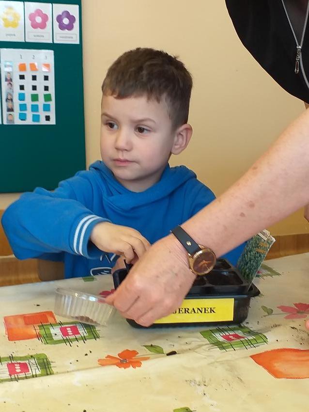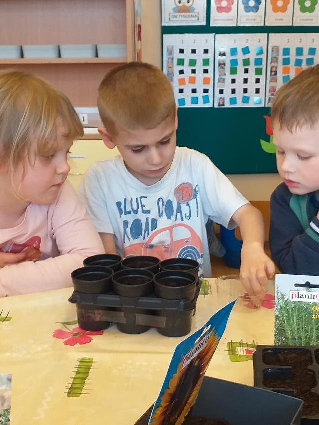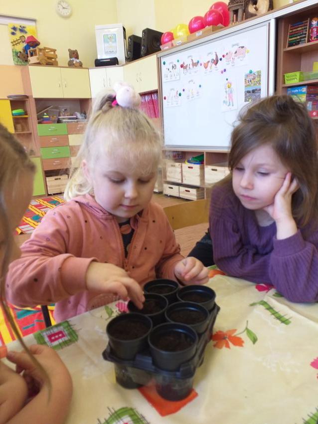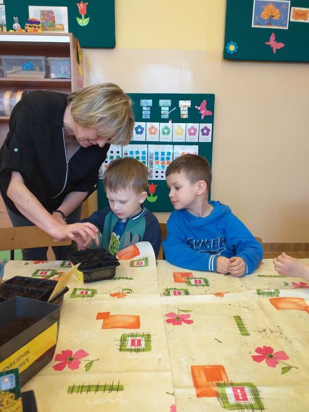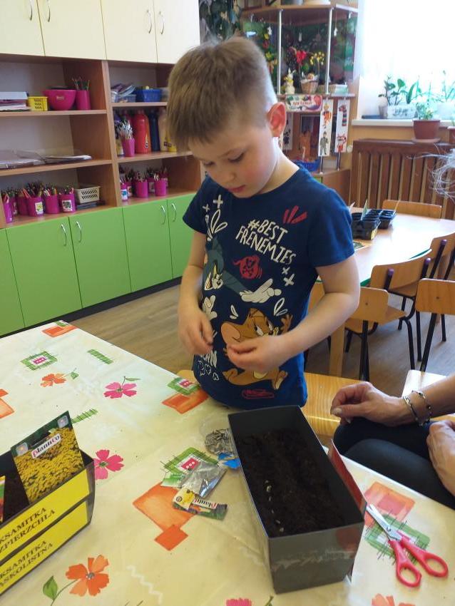 Dzieci z wielkim zaangażowaniem sieją nasiona kwiatów ozdobnych i ziół do donic na parapet okienny. Będziemy prowadzić obserwacje wzrostu roślin, a kiedy pogoda dopisze przesadzimy je do skrzyni ogrodowej grupy MISIÓW.