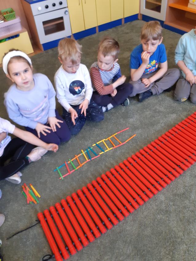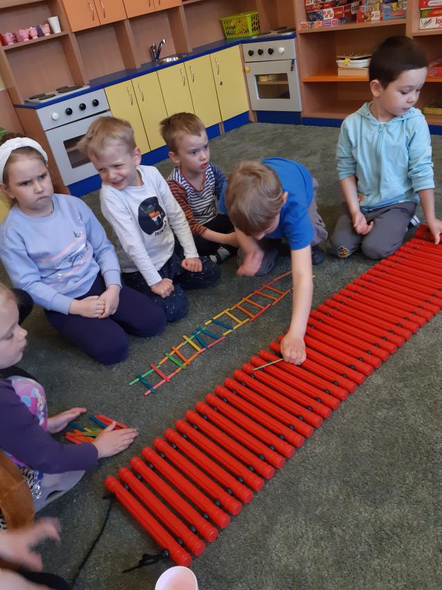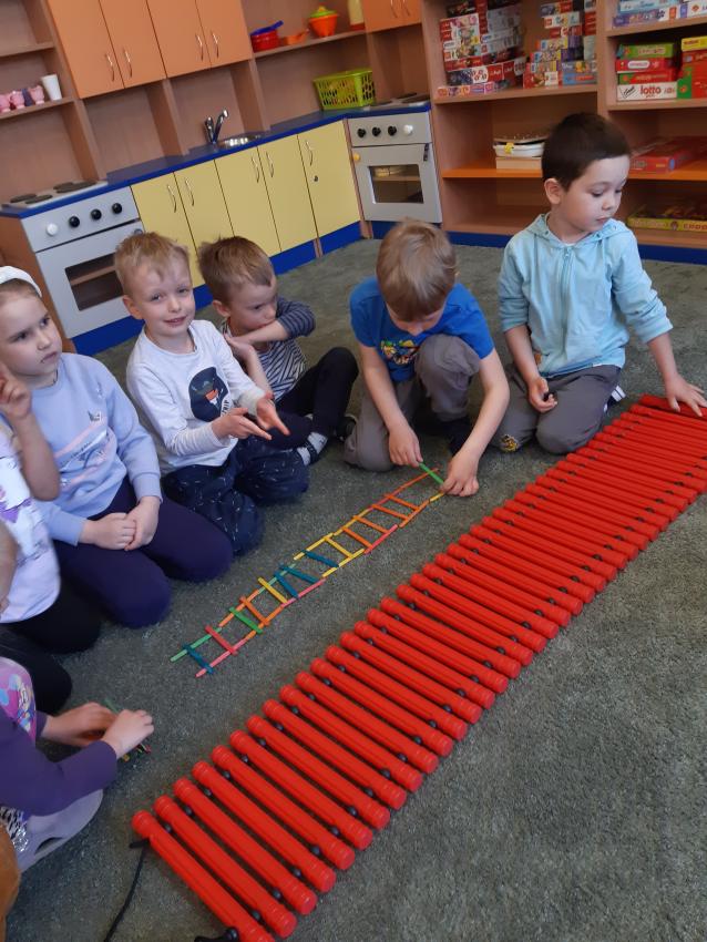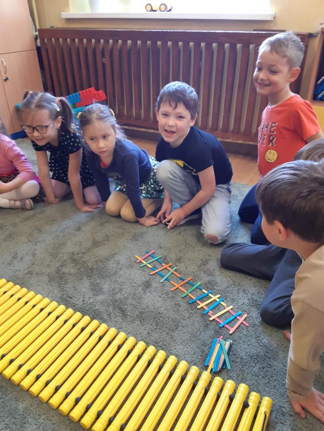 Strażak powinien mieć umiejętność szybkiego reagowania i współdziałania z grupą .Sprawdziliśmy nasze umiejętności współpracy podczas wspólnego układania "drabiny strażackiej" .Grupy musiały wykazać się szybkim liczeniem ,stosowaniem liczebników porządkowych ,stosowaniem pojęć wysoko , nisko , oraz umiejętnością współpracy w swoim zespole . Egzamin został zdany.