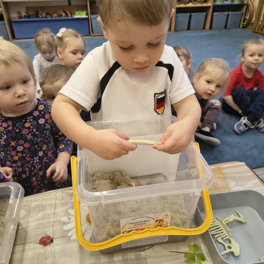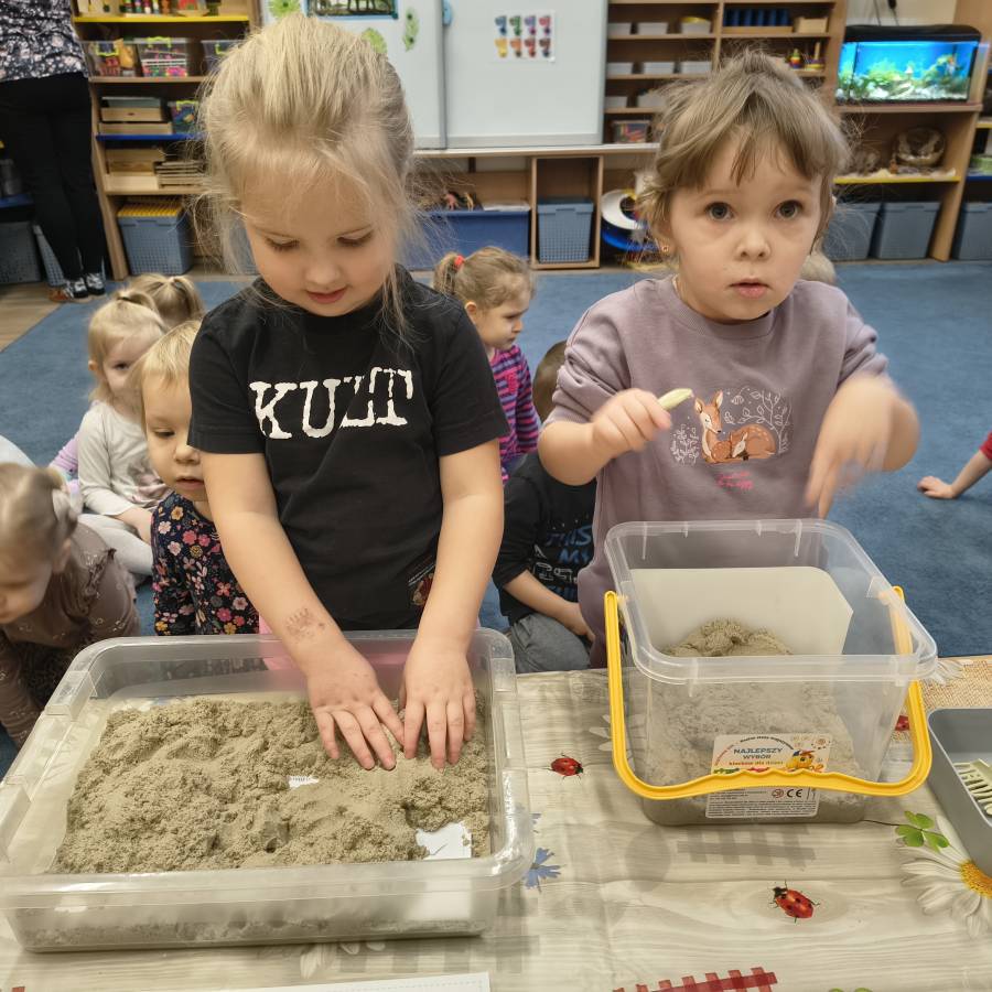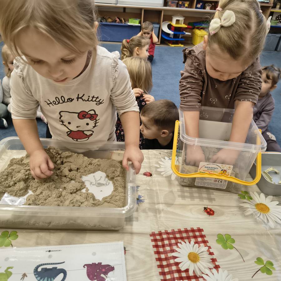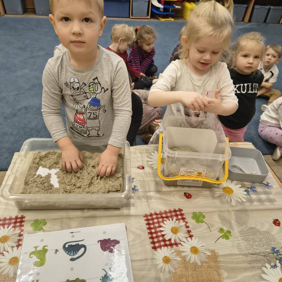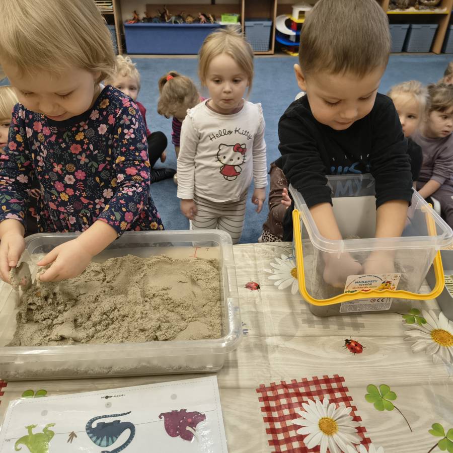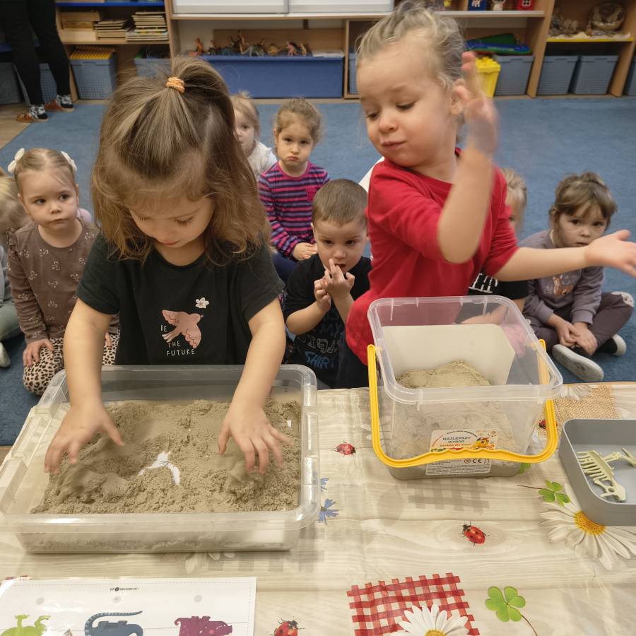 Dzieci poszukiwały w piasku kinetycznym kości dinozaurów, odciski łap, skamieniałe muszle, rośliny.