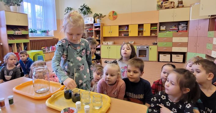 Podczas eksperymentu dzieci z uwagą obserwowały powstawanie kolorów, odkrywały mieszanie się płynów. Samodzielne przelewanie wody z barwnikami, łączenie z puszystą watą oraz mieniącym się brokatem umożliwiło dzieciom rozbudzenie wyobraźni oraz kreatywności. Obserwacja naszej galaktyki zainspirowała przedszkolaki do tworzenia własnych gwiazdozbiorów oraz planet.
