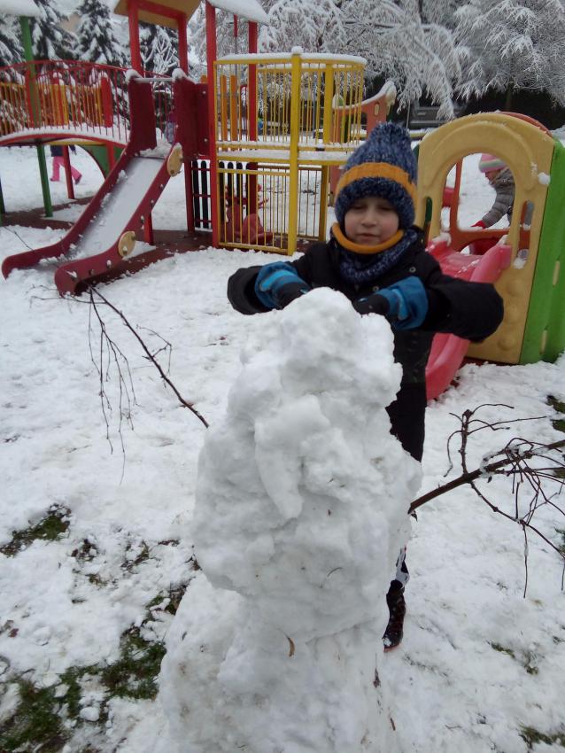 Wesołe zabawy na śniegu. Tygryski budują bałwanki. Śnieg był wspaniały, radości wiele.