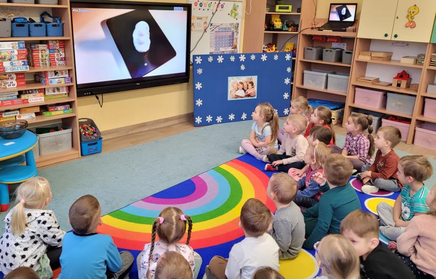 W dniu 24.01.2023 r. grupa Żabki w ramach Innowacji Mali Einsteini - czyli doświadczenia, eksperymenty i sensoplastyka dla dzieci w wieku przedszkolnym brała udział w zajęciach Biały puch - czyli badanie właściwości śniegu. Dzieci obejrzały film edukacyjny Jak powstaje śnieg? Następnie dowiedziały się, co jest potrzebne, aby powstał śnieg oraz, że śnieżynki mają różne kształty. Elementem naszych zajęć była również Gimnastyka w podskokach, gdzie dzieci naśladowały ruchem lepienie bałwana. Kolejno badaliśmy przyniesiony do przedszkola śnieg, po czym nastąpiła burza mózgów , w której chętne przedszkolaki rozważały czy biały puch jest czysty. Odpowiedź otrzymaliśmy na koniec zajęć, kiedy śniegowy bałwanek się roztopił. Wykonaliśmy także pracę plastyczną malowaną nietypową metodą czyli pianką.