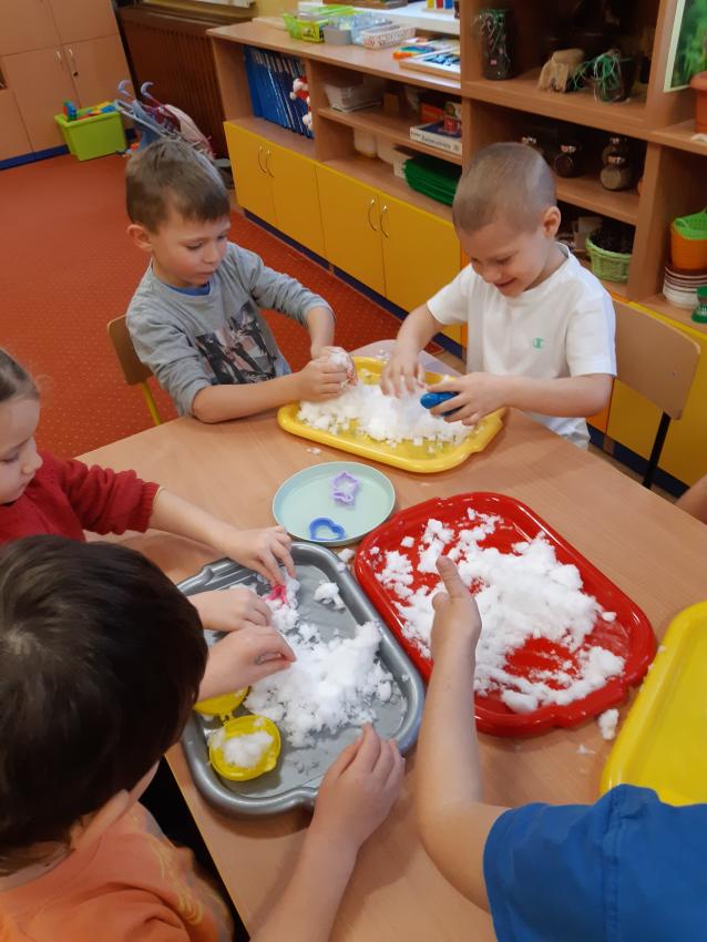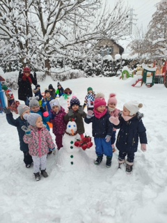 Korzystamy z uroków zimy w ogrodzie przedszkolnym. Cieszymy się padającym śniegiem. Ale pamiętamy również o dokarmianiu ptaków w naszych karmnikach.
