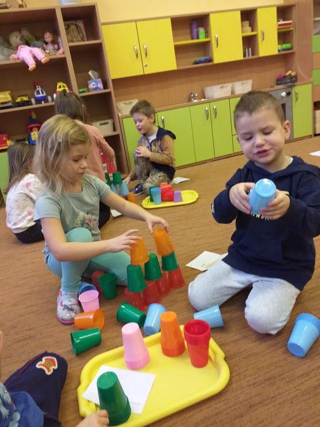 Zgodnie współpracujemy w małych zespołach. Odczytujemy podany kod i układamy wzór z kolorowych kubków.