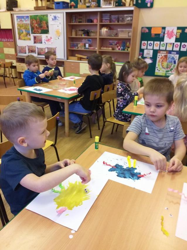 Korzystając z własnej wyobraźni tworzymy bajkowe stworki. Dobrze się bawimy rozdmuchując kleksy z farby przez rurki.