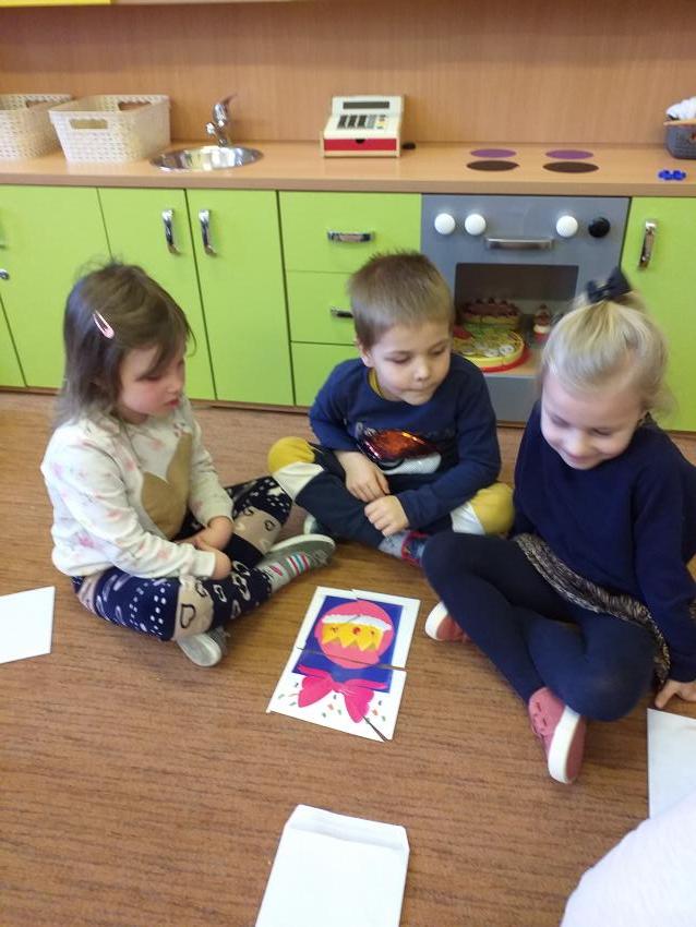 Układamy obrazki pocięte na części rozwijając koncentrację i pamięć wzrokową. Dzielimy się swoimi umiejętnościami z koleżankami i kolegami z grupy.
