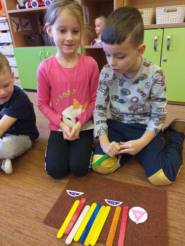 Wykonujemy działania na dodawanie za pomocą kolorowych patyczków. Szukamy prawidłowego wyniku podanego na bańce choinkowej.