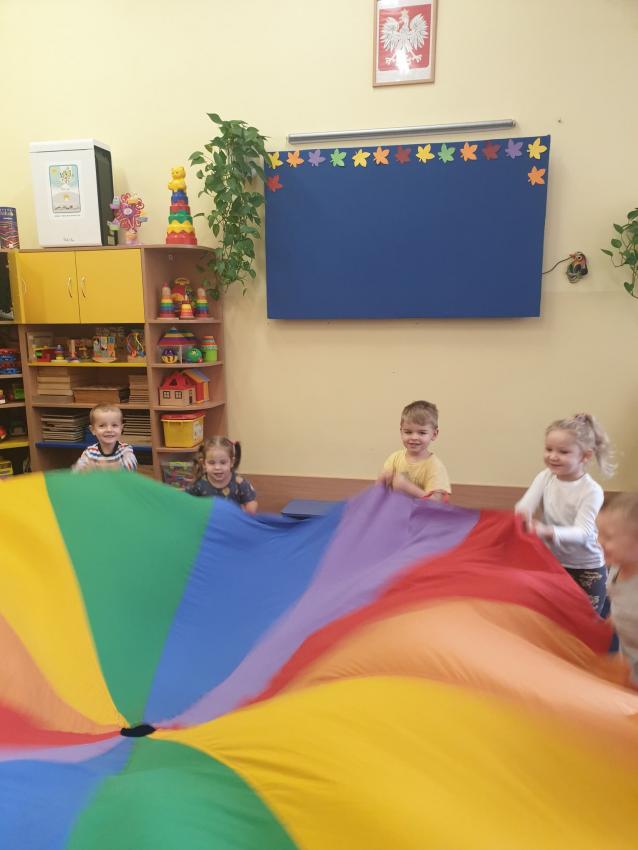 Dzisiaj Motylki bawiły się chustą animacyjną. Uczestniczyły w zabawach orientacyjno - porządkowych, ćwicząc dużą motorykę