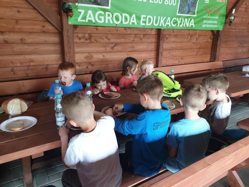 Tego dnia grypa Rybki wybrała się na wycieczkę do relaksowiska Red Raj w Młoszowej. Dzieci mogły korzystać z różnego rodzaj zamków dmuchanych, torów przeszkód gdzie ćwiczyły swoją koorydancję ruchową oraz sprawność fizyczną, a przedewszytskim dobrze się bawiły. W czasie dowolnej aktywności dzieci mogły korzystać z tyrolki, boiska sportowego, siłowni pod chmurką, trampolin, labiryntu sprawnościowego, kręgli, a także miały okazję wydoić sztuczną krowę oraz kozę. W czasie przerwy przedszkolaki posiliły się przyrządzaoną przez gospodarza kiełbaską z grila. Najwiekszą atrakcją dla dzieci okazały się mieszkające tam zwierzęta, które mogły karmić. Wsród nich znalazły się alpaki, strusie, pawie, łabędzie czarne, króliki, kozy i wiele innych.