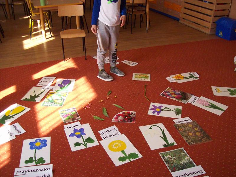 Dzieci z grupy Rybek poznały budowę kwiatu oddzielając jego części, poznały też pierwsze wiosenne kwiaty i czytały ich nazwy.