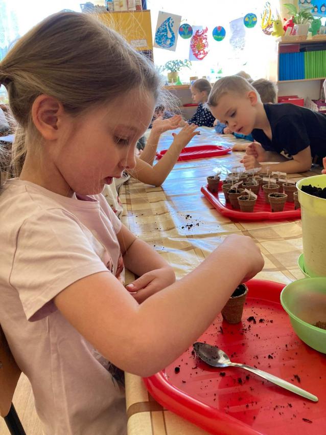 Przedszkolaki zapoznają się z etapami wzrostu roślin i czynnikami potrzebnymi do ich rozwoju. Dzieci z dyżym zaangażowaniem uczestniczą w samodzielnym wysiewaniu nasion.