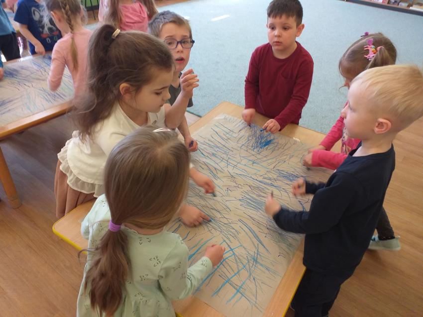 Dzieci z grupy KOTKÓW bawią się wykorzystując metodę edukacji przez ruch wg D. Dziamskiej. Przedszkolaki współpracują w małych grupach, tworząc pracę "Wiosenny deszczyk". Kreślą rytmiczne kreski w rytm utworu Fantasia Mobile.