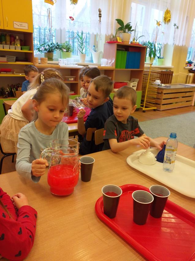 Dzieci przy okazji poznania zawodu barmana kształtują umiejętność szacunkowego porównywania płynów - "kolorowych soków". Bawią się świetnie: mierzą, szacują, przelewają i oceniają poprawność przygotowanej ilości płynu.